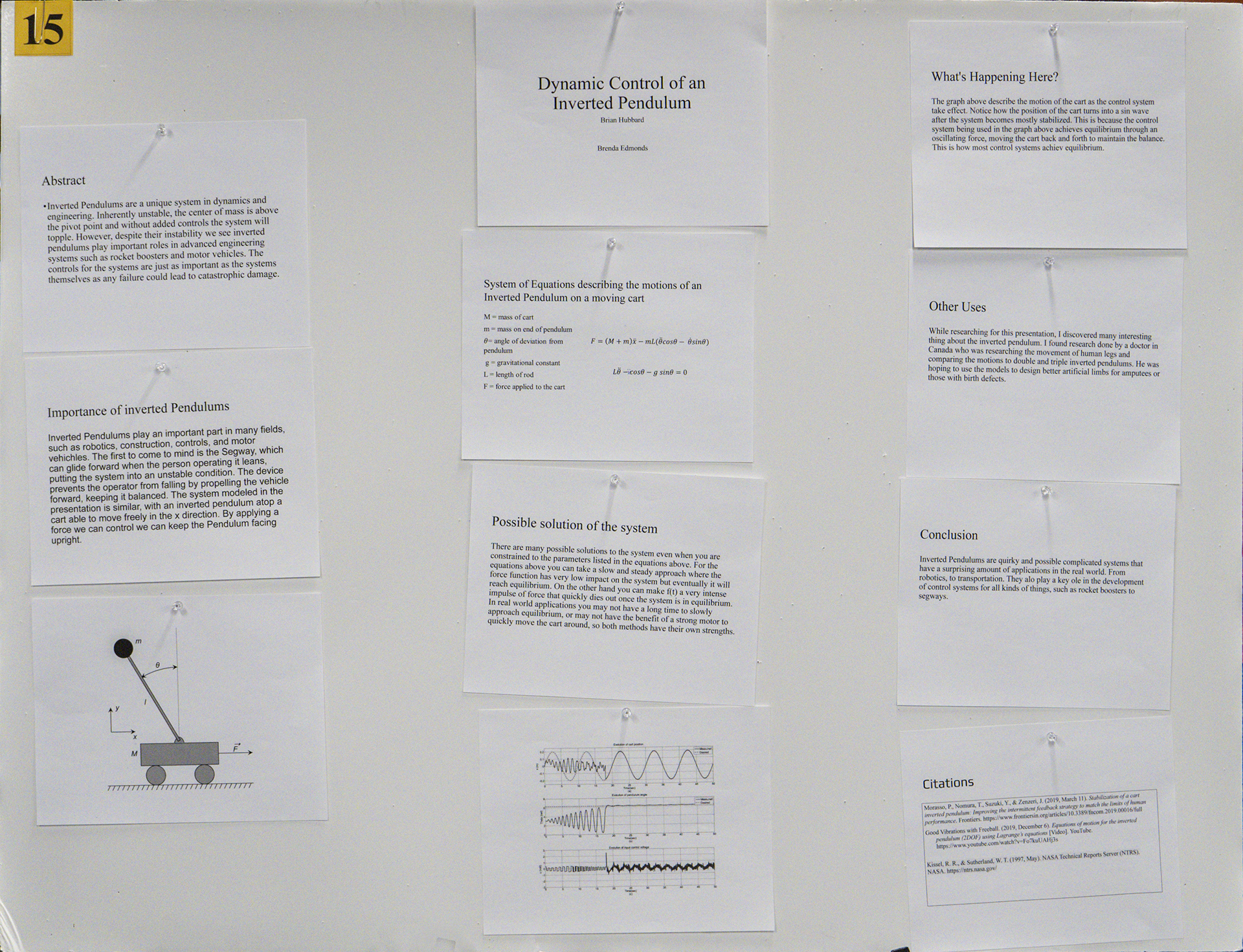 Inverted Pendulums are a unique system in dynamics and engineering. Inherently unstable, the center of mass is above the pivot point and without added controls the system will topple. However, despite their instability we see inverted pendulums play important roles in advanced engineering systems such as rocket boosters and motor vehicles. The controls for the systems are just as important as the systems themselves as any failure could lead to catastrophic damage.
