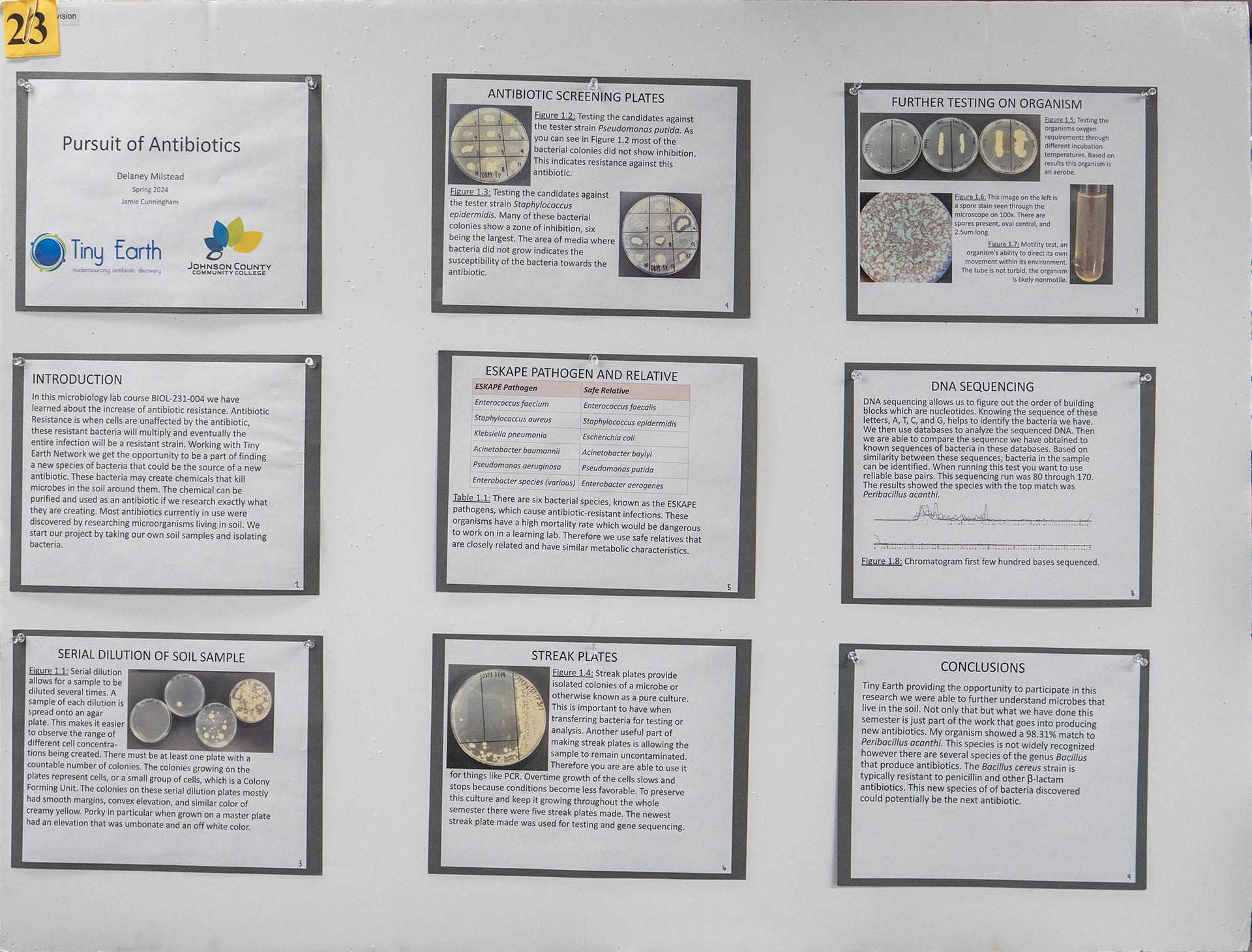 In this microbiology lab course BIOL-231-004 we have learned about the increase of antibiotic resistance. Antibiotic Resistance is when cells are unaffected by the antibiotic, these resistant bacteria will multiply and eventually the entire infection will be a resistant strain. Working with Tiny Earth Network we get the opportunity to be a part of finding a new species of bacteria that could be the source of a new antibiotic. These bacteria may create chemicals that kill microbes in the soil around them. The chemical can be purified and used as an antibiotic if we research exactly what they are creating. Most antibiotics currently in use were discovered by researching microorganisms living in soil. We start our project by taking our own soil samples and isolating bacteria. I tested 12 microbes against eight different tester strains to check for zones of inhibition. A zone of inhibition is an area around the bacteria where there is no growth because of the chemical created by the microbe preventing the growth of other microbes. In my case I chose candidate number 6 because it inhibited the tester strain Staphylococcus epidermidis. This species of bacteria we use in the lab is related closely to Staphylococcus aureus which is a pathogen capable of causing severe MRSA infections. The inhibition of this safe relative suggests the presence of a possible antibiotic that could be used to treat staph infections.