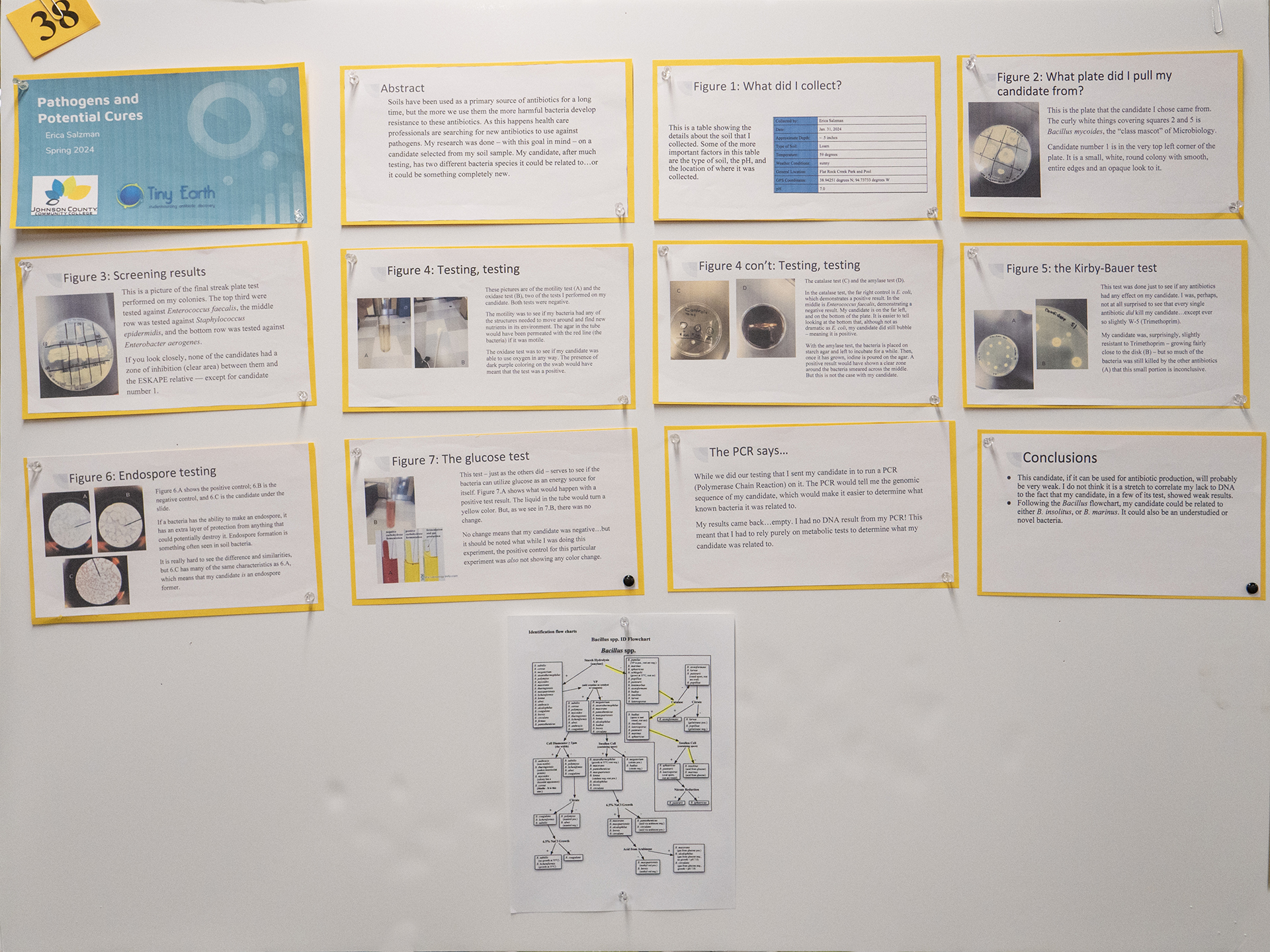 Soil has been used as the main source of antibiotic-producing bacteria for a long time. But as time goes by the viruses we use antibiotics against become more resistant, and soon the antibiotic becomes ineffective. As the antibiotics we use become less effective, we have to search in other places. For my research to find a potentially new antibiotic, I collected a soil sample from Flat Rock Creek Park and Pool. The sample was collected from this location because the park has a lot of people that visit it, and I thought that where there are people – there are pathogens. Thus a soil sample taken from where a lot of people are frequently would have several potential candidates for a new antibiotic. After collecting the soil sample, I took it to be screened. After a long time of testing my various colonies within the sample against different ESKAPE relatives, the colony numbered “1” was inhibiting ESKAPE relative Enterococcus faecalis. The fact that “colony 1” is inhibiting the growth of Enterococcus faecalis could point to the potential that it will inhibit and become a new antibiotic to treat the ESKAPE pathogen Enterococcus faecium, but a lot of testing needs to be done before we can be sure if this could be the case. One of those things to be done is to run a Polymerase Chain Reaction on a sample from this colony to obtain a bit of its DNA. It will be interesting to see the results of the PCR.