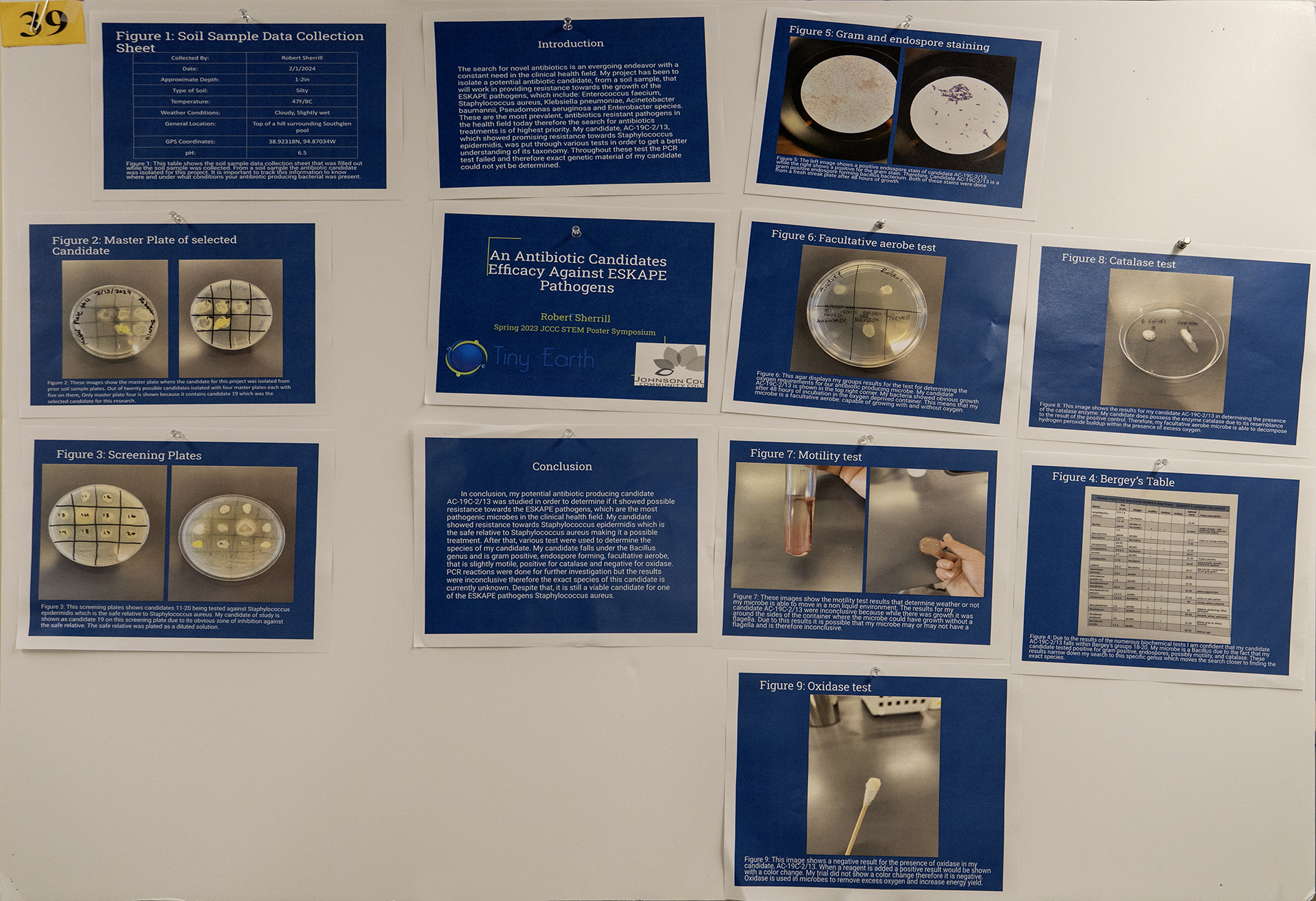 Pathogenic bacteria, or disease causing microorganisms, have always been an enemy towards human survival. It wasn’t till the discovery of penicillin, the first discovered antibiotic, that gave us a fighting chance in defending ourselves against disease causing agents. Antibiotics are either naturally occurring or synthetically produced compounds that destroy or kill microorganisms. Now, the discovery and popularization of these antibiotics has become a driving force in the clinical health field, which serves extraordinary importance for human health. My research is to isolate these antibiotic producing bacteria from soil samples collected locally, and test their antimicrobial abilities against the ESKAPE pathogens. The ESKAPE pathogens (Enterococcus faecium, Staphylococcus aureus, Klebsiella pneumoniae, Acinetobacter baumannii, Pseudomonas aeruginosa, and Enterobacter species), are the main culprits of infections acquired in the health field. Therefore, the importance in treating them is high. From a soil sample collected atop a hill adjacent to a pool in South Glen, Olathe Kansas, I isolated an antibiotic producing bacteria. This antibiotic producing bacteria has shown resistance towards Staphylococcus epidermidis, which is a safe-to-work with relative of Staphylococcus aureus. This therefore shows promise towards being a viable antibiotic candidate against the Staphylococcus aureus pathogen. If this discovery shows full resistance towards Staphylococcus aureus then it could become an important medical tool for treating diseases caused by one of the ESKAPE pathogens, giving a better fighting chance to those in need. With older antibiotics becoming ineffective to mutating pathogens it is highly important to seek new antimicrobial species capable of fully defending people.