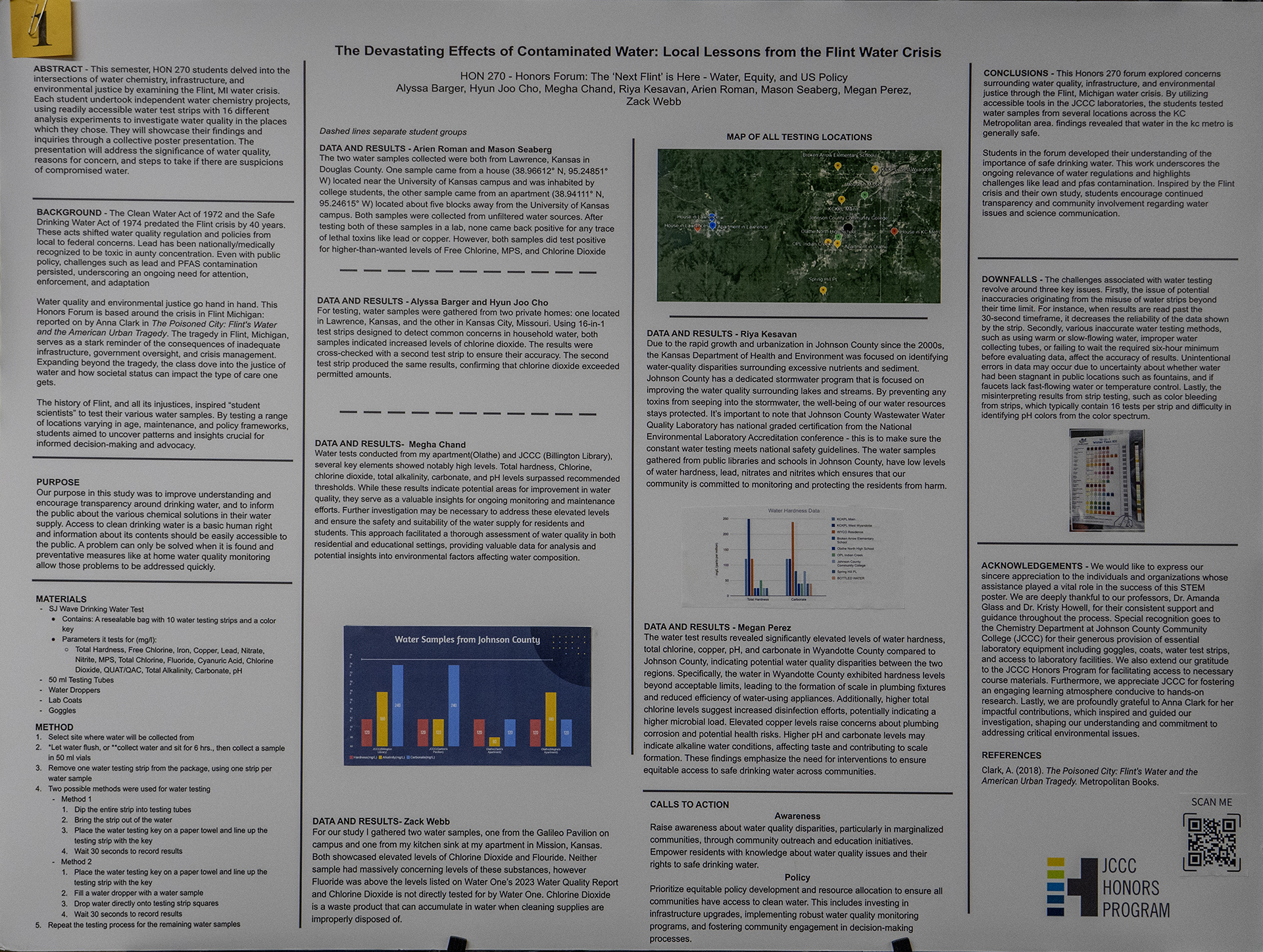 This research poster, presented as part of an honors forum, explores the connections among social and environmental justice, science communication, and accessibility to clean water, beginning with the story of the ongoing water crisis in Flint, Michigan. Working in pairs, students applied lessons from Anna Clark’s “The Poisoned City” to their choice of tests performed on water samples collected from locations they chose within an x km radius of Kansas City. Taken together, students’ work highlights the power of community action and engagement, equitable policy development, and the importance of community awareness.