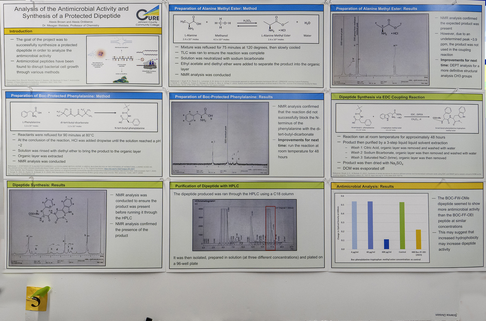 Antimicrobial peptides (AMP), due to their broad inhibitory effects on common pathogenic bacteria, are a growing area of interest within the pharmaceutical industry. In this project, two amino acids, alanine and phenylalanine, will be coupled in order to produce a dipeptide. Protecting the N-terminus of the phenylalanine with a tert-butyloxycarbonyl (BOC) group and the C-terminus of the alanine as a methyl ester allows only one type of dipeptide to form. The antimicrobial activity of the synthesized dipeptide will be evaluated and compared to other dipeptides currently understood to have antimicrobial activity.