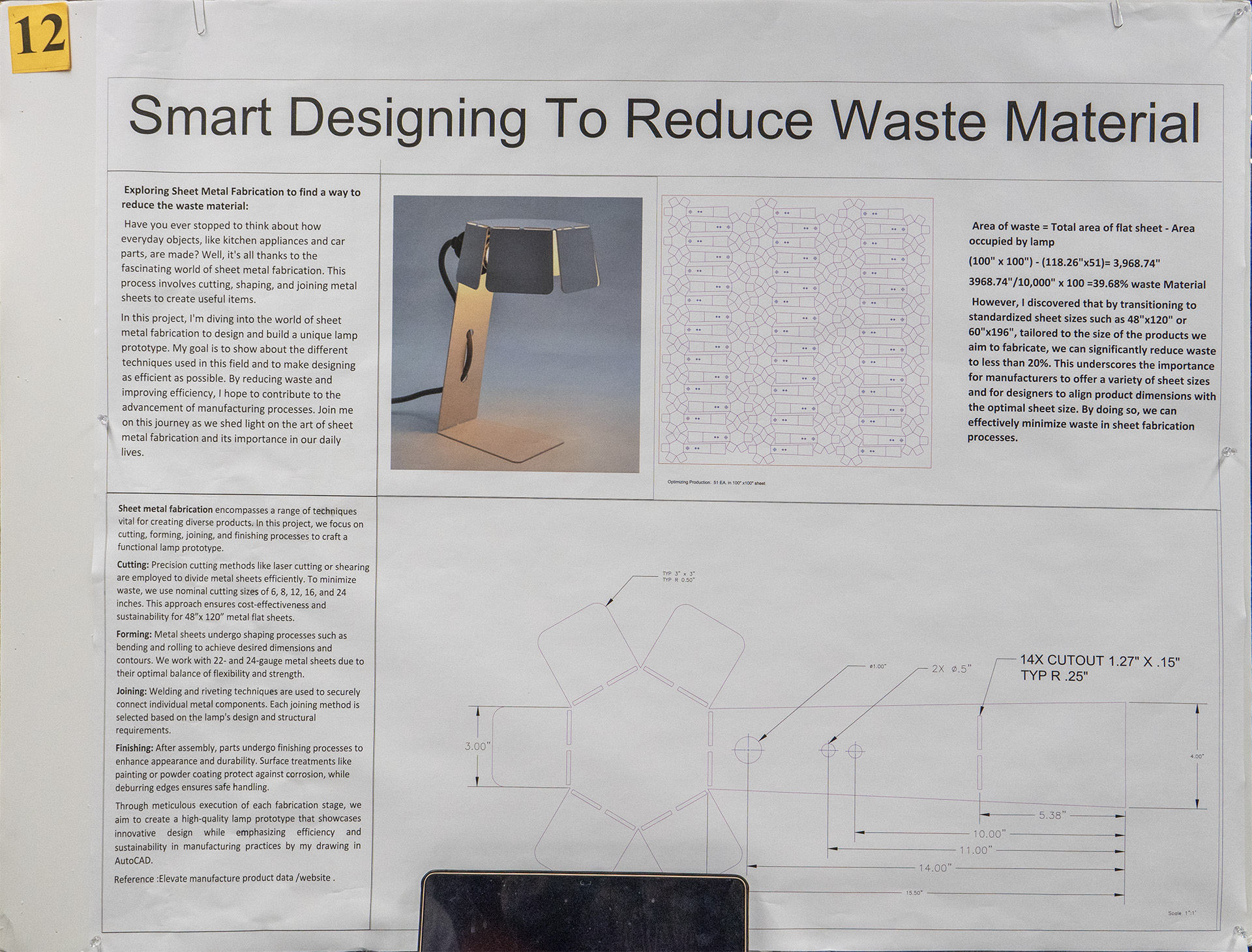 Sheet metal fabrication is a fascinating process that underpins the creation of everyday items like kitchen appliances and car parts. In this project, I delve into this world to design and construct a unique lamp prototype, aiming to showcase various fabrication techniques and optimize the design process for efficiency. By minimizing waste and improving efficiency, my goal is to contribute to the advancement of manufacturing processes. Join me on this journey as we illuminate the art of sheet metal fabrication and its significance in our daily lives. Sheet metal fabrication involves cutting, forming, joining, and finishing processes essential for crafting diverse products. Precision cutting methods such as laser cutting and shearing are used to divide metal sheets efficiently. To reduce waste, we employ nominal cutting sizes of 6, 8, 12, 16, and 24 inches, ensuring cost-effectiveness and sustainability for 48”x 120” metal flat sheets. Metal sheets undergo shaping processes like bending and rolling to achieve desired dimensions and contours. We work with 22- and 24-gauge metal sheets due to their optimal balance of flexibility and strength. Welding and riveting techniques securely connect individual metal components, selected based on the lamp's design and structural requirements. After assembly, parts undergo finishing processes to enhance appearance and durability. Surface treatments like painting or powder coating protect against corrosion, while deburring edges ensures safe handling. Through meticulous execution of each fabrication stage, our aim is to create a high-quality lamp prototype that showcases innovative design while emphasizing efficiency and sustainability in manufacturing practices. References: Elevate manufacture product data/https://www.holcimbe.com/en