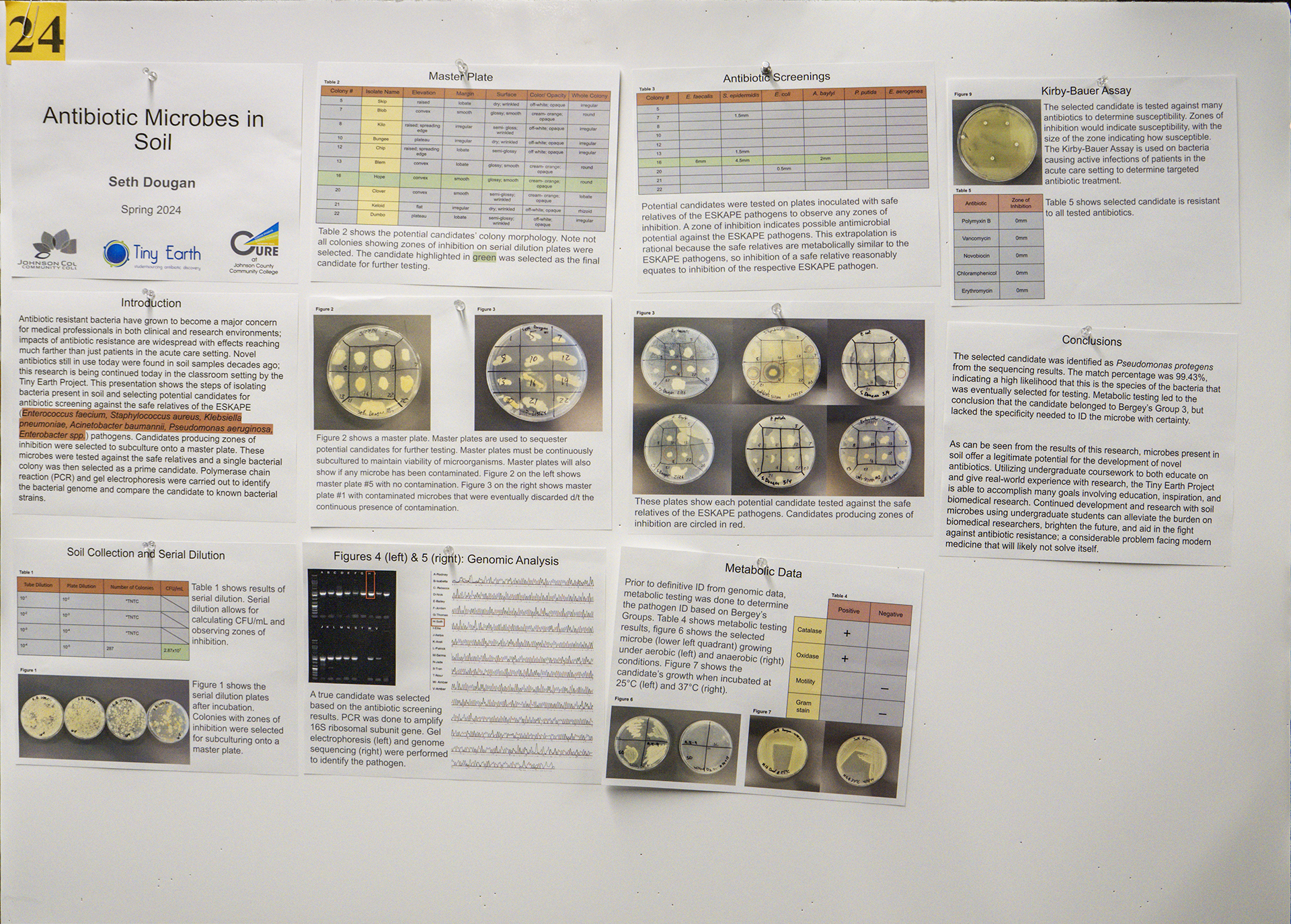 Antibiotic resistant bacteria have grown to become a major concern for medical professionals in both clinical and research environments; impacts of antibiotic resistance are widespread with effects reaching much farther than just patients in the acute care setting. Novel antibiotics still in use today were found in soil samples decades ago; this research is being continued today in the classroom setting by the Tiny Earth Project. This paper presents the steps of isolating bacteria present in soil and selecting potential candidates for antibiotic screening against the safe relatives of the ESKAPE (Enterococcus faecium, Staphylococcus aureus, Klebsiella pneumoniae, Acinetobacter baumannii, Pseudomonas aeruginosa, Enterobacter spp.) pathogens derived from said soil sample. Candidates producing zones of inhibition were selected to subculture onto a master plate. These microbes were tested against the safe relatives and a single bacterial colony was then selected as a prime candidate. Polymerase chain reaction (PCR) and gel electrophoresis were carried out to identify the bacterial genome and compare the candidate to known bacterial strains.