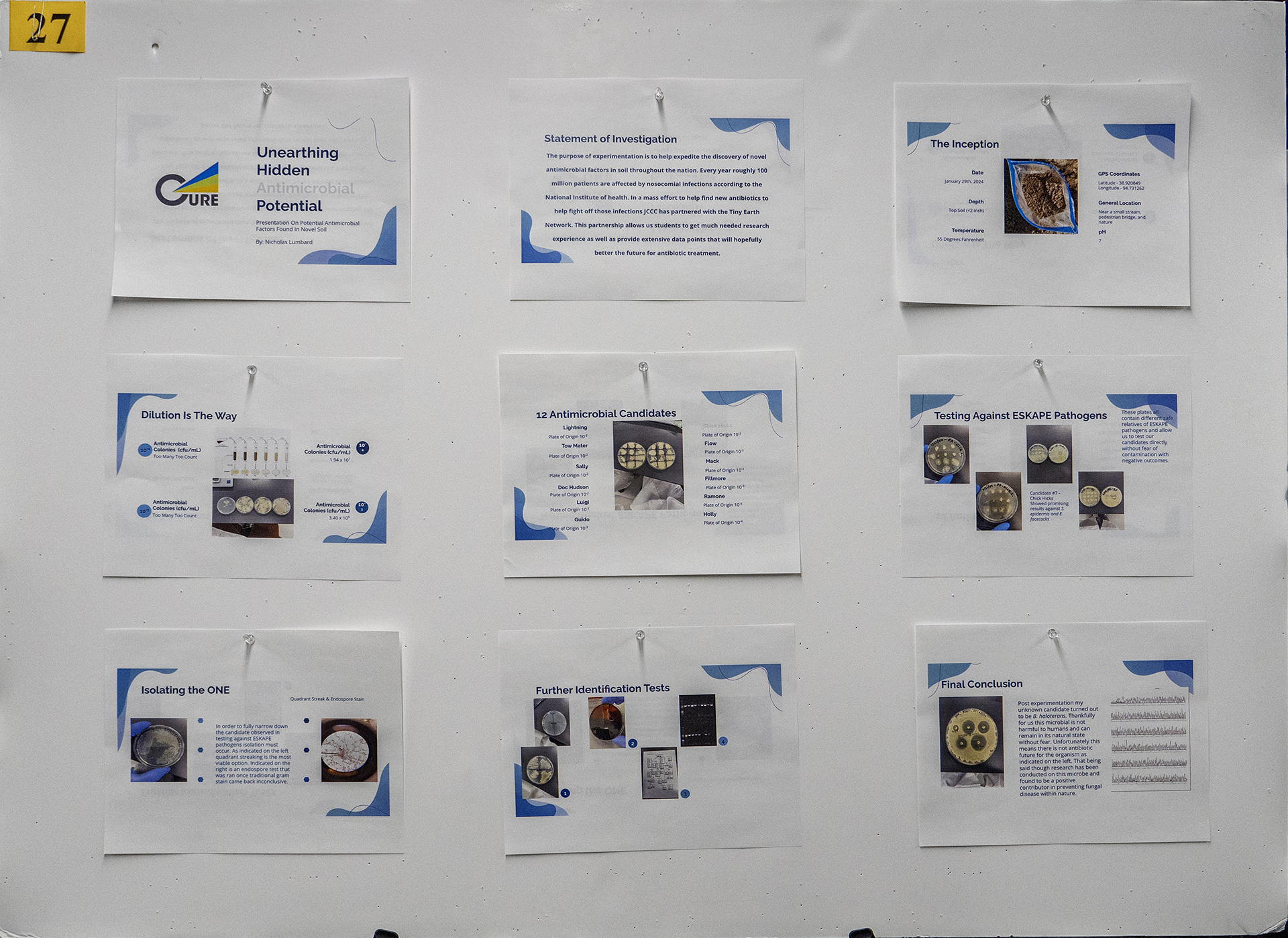 For almost 96 years to date, we as mankind have had the pleasant knowledge of antibiotic ability and efficacy in treating infectious disease. While the revelation of antibiotics has been an exponential breakthrough in medical treatment there have been no nuanced discoveries since the 70’s well over half a century. That knowledge alone is discouraging, but thanks to programs such as CURE we as a student body are delighted to be looking for a future for antimicrobial advantage in healthcare. In the project we simply took a random sample of dirt in hopes of finding microbial candidates to be cultured and tested. In order to examine the candidates for optimal antibiotic activity specific techniques such as gram stain, culturing, PCR, etc. were used. In combination with Safe Relatives of ESKAPE pathogens we were able to take promising candidates and test them directly to see if any resistance was feasible. This overall approach allowed for multiple micro research studies to be conducted in hopes of taking a macro jump in the future for antibiotic treatment for the greater good.
