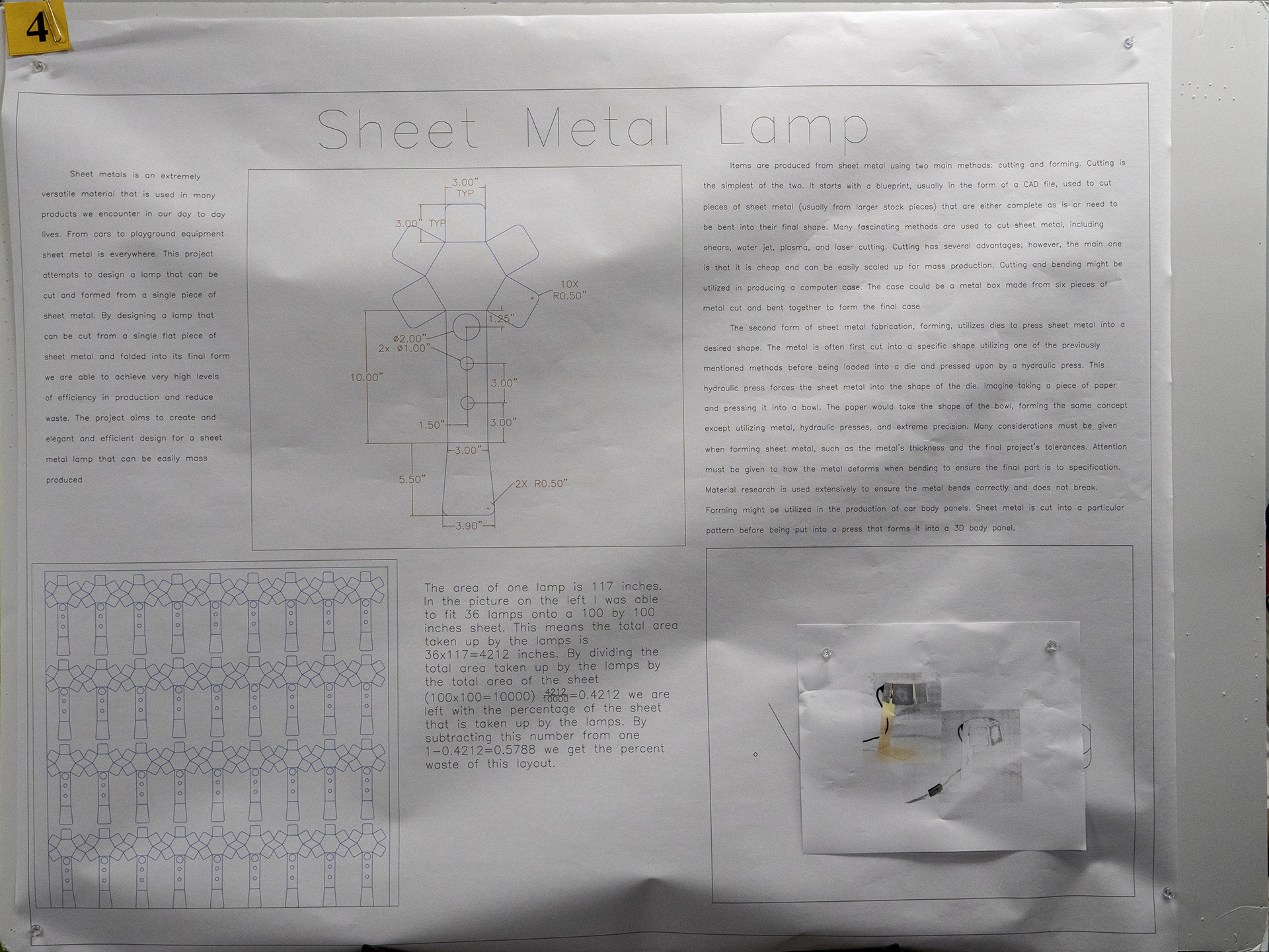 Sheet metals is an extremely versatile material that is used in many products we encounter in our day to day lives. From cars to playground equipment sheet metal is everywhere. This project attempts to design a lamp that can be cut and formed from a single piece of sheet metal. By designing a lamp that can be cut from a single flat piece of sheet metal and folded into its final form we are able to achieve very high levels of efficiency in production and reduce waste. The project aims to create and elegant and efficient design for a sheet metal lamp that can be easily mass produce