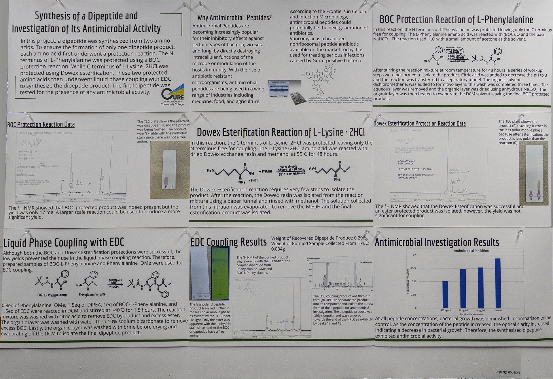 Dipeptides can be synthesized for numerous purposes, one of the possible functions is as an antimicrobial agent. A dipeptide will be synthesized from two different amino acids. The N-terminus of one amino acid will be protected using a BOC protecting group while the C-terminus of the other amino acid will be protected by undergoing a Fischer Esterification reaction. The protected amino acids will then undergo liquid phase coupling using EDC to synthesize the final selected dipeptide. The lab synthesized dipeptide will then be tested and analyzed to determine if it exhibits any antimicrobial activity.