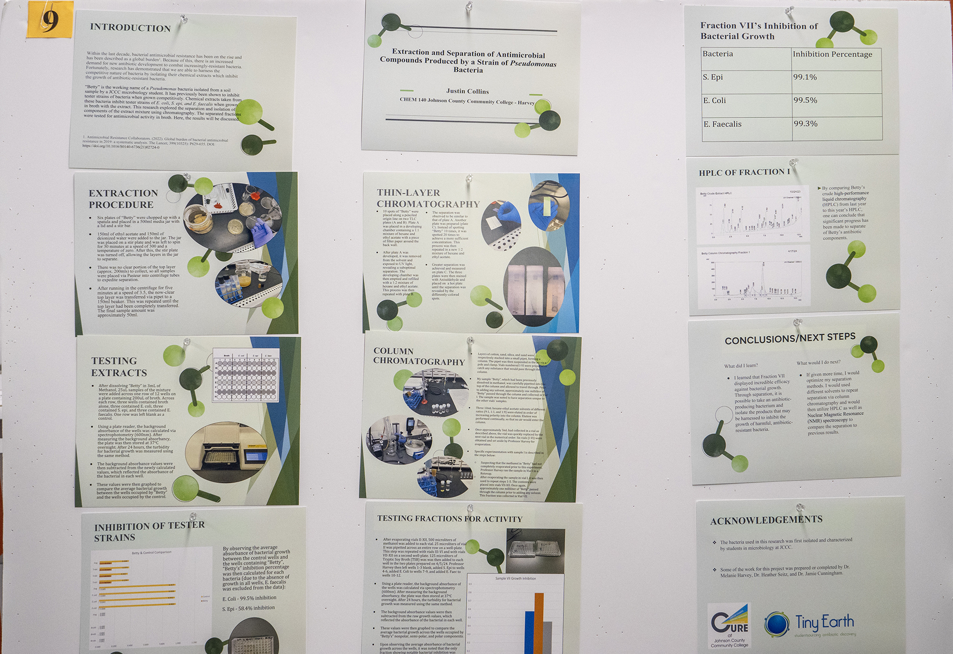 “Betty” is the working name of a bacteria collected by a JCCC microbiology student. It has previously been shown to inhibit tester strains of bacteria when grown competitively. Chemical extracts taken from these bacteria inhibit tester strains of both E. coli and S. epi when grown in broth with the extract. This research explored the separation and isolation of components of the extract mixture using chromatography. The separated fractions were tested for antimicrobial activity in broth. The results will be discussed.