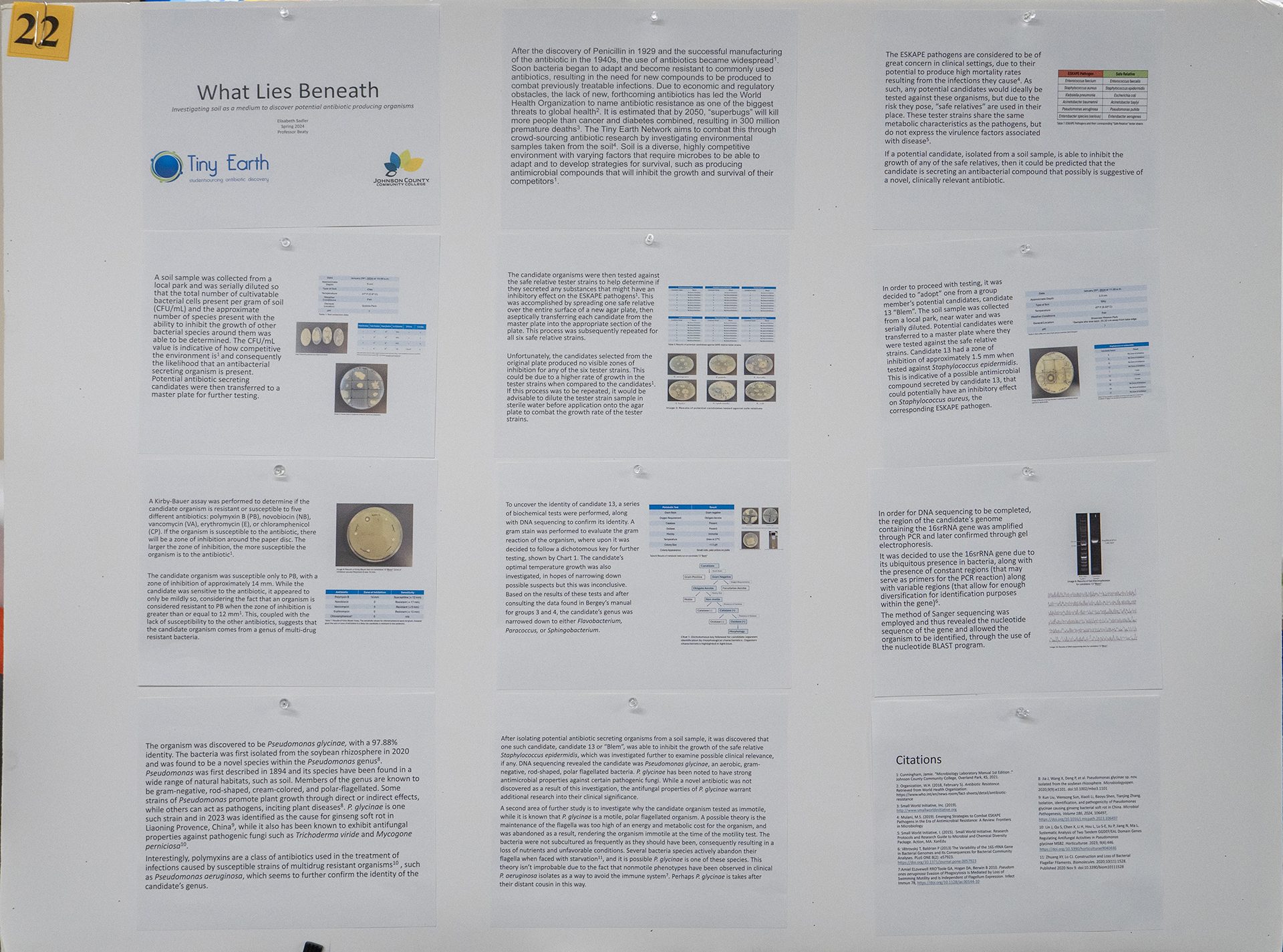 Due to the highly competitive nature of soil, microbes produce chemicals that inhibit the growth of other microbes. This type of competition favors bacteria that can then produce an antibiotic, allowing soil to be a verifiable gold mine of potential antibiotic producing microbes, thus helping to solve the problem of antibiotic resistance. After serially diluting previously collected soil samples and testing the antibiotic candidates found in the sample against the ESKAPE safe relatives, it was discovered that one potential candidate, “Blem” exhibited antibacterial qualities against Staphylococcus epidermidis. Using PCR analysis and subsequent gel electrophoresis, the DNA of Blem was then sent to an outside facility for sequencing. The properties of this compound studied thus far suggest the discovery of a novel antibiotic and will require further study, such as performing a disc diffusion assay to determine the Minimum Inhibitory Concentration (MIC).