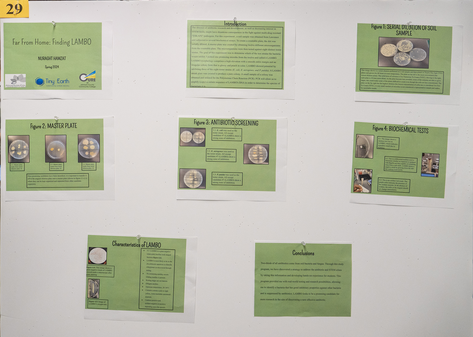 The absence of antibiotic research and development, as well as decreasing interest in STEM fields, might have disastrous consequences in the fight against multi-drug resistant "ESKAPE" pathogens. For this experiment , a soil sample was obtained from Lawrence and subjected to several biochemical assays. To create a countable plate, the dirt was serially diluted. A master plate was created by obtaining twelve different microorganisms from the countable plate. The microorganisms were then tested against eight distinct tester strains. The goal of this experiment was to determine which of the test strains the bacteria would inhibit. I picked one promising microbe from the twelve and called it LAMBO. LAMBO morphology comprises a high elevation with a smooth entire margin and an irregular colony form that is glossy and peach in color. LAMBO showed potential by inhibiting three of the eight tester strains (E. coli, E. aerogenes, and P. putida). A LAMBO streak plate was created to produce a pure colony. A small sample of a colony was obtained and utilized for the Polymerase Chain Reaction (PCR). PCR will allow us to amplify (copy) a certain sequence of LAMBO's DNA in order to determine the species of bacterium it is.