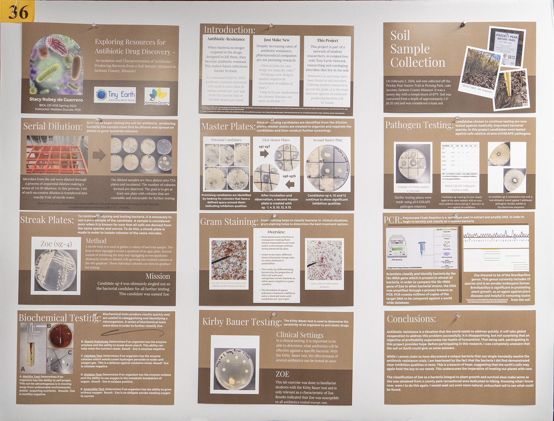 When bacteria no longer respond to the drugs designed to kill them, they become antibiotic-resistant, making future infections harder to treat. Without the development of new antibiotics to fight these “super” bacteria, we face a future of increasing death rates due to infections that otherwise should be treatable. In response to this growing public health threat, a soil sample was obtained from Fleming Park, a 7,800-acre recreational parkland in Jackson County, Missouri, to discover and isolate potential undiscovered antibiotic-producing bacteria in the soil. Through serial dilution of the sample, 15 bacterial colonies were isolated for further testing. Ultimately, six bacterial colonies were chosen for additional testing for inhibition against ESKAPE pathogen relatives. ESKAPE is an acronym for the names of six highly virulent and antibiotic-resistant bacterial pathogens. In the student lab setting, safe relatives of these pathogens were used to test the soil bacterial candidates in terms of their ability to inhibit the growth of these bacteria. Ultimately, one candidate stood out in its ability to inhibit pathogens' growth around it, and this candidate was named Zoe. Zoe showed promising results in inhibiting several tester strains of pathogens. There was a clear and significant inhibition zone against Bacillus subtilis, Mycobacterium smegmatis, and Enterococcus faecalis. Additionally, there was moderate inhibition against Acinetobacter baylyi and Pseudomonas putida , and slight inhibition against Escherichia coli and Enterobacter aerogenes. Gram and spore staining showed that Zoe was a gram-positive spore-forming rod bacterium. Polymerase Chain Reaction (PCR) and Gel Electrophoresis were conducted for DNA analysis.