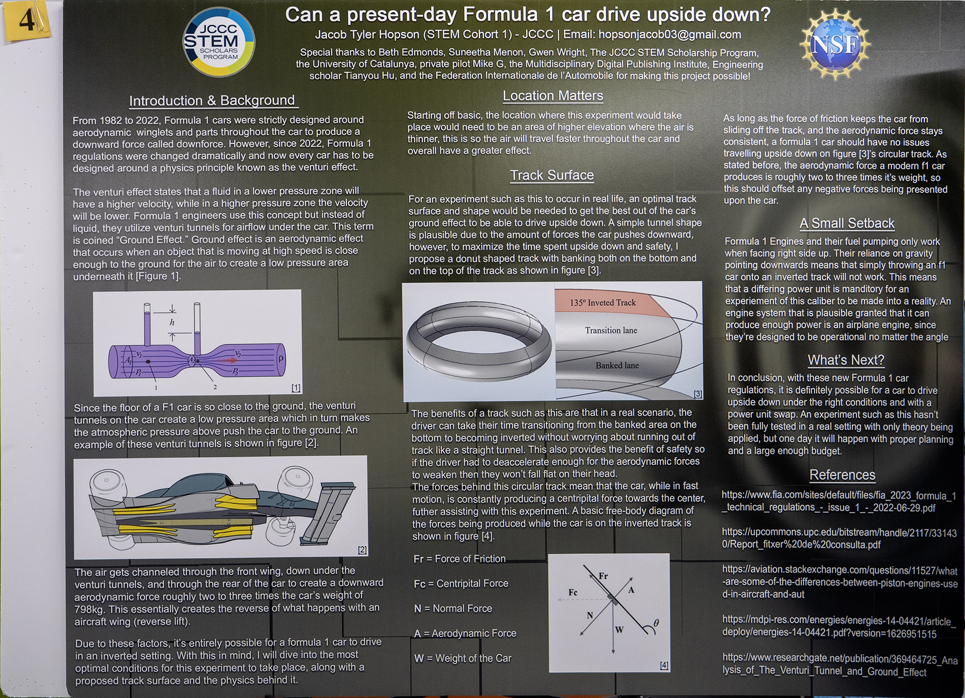 My goal for this research project is to determine whether a present day formula 1 car (2022 and beyond) could drive upside down in the right conditions. This project will dive into two major areas necessary that will determine the possibility of this experiment. Firstly, these cars are built around a singular physics principle called the Venturi effect, which channels air through thin tunnels creating a vacuum effect keeping the cars stuck to the ground. Secondly, this effect will be combined with the most optimal conditions necessary and what kind of surface the car will drive on that will generate successful results.