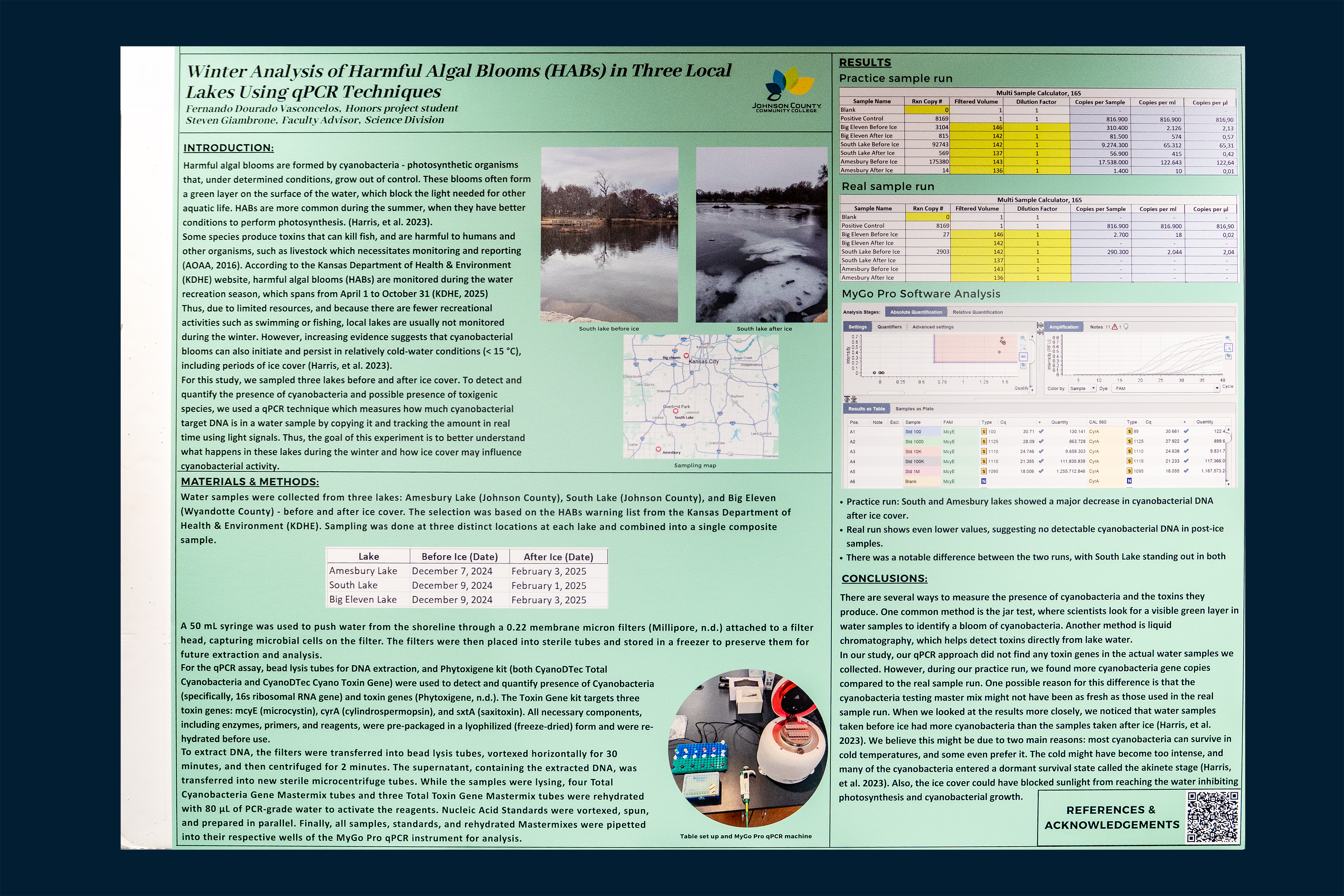 This study focusses on investigating for the presence of cyanobacteria associated with Harmful Algal Blooms (HABs) during the winter using quantitative Polymerase Chain Reaction (qPCR) techniques for detection and analysis. HABs are the result of overgrowth of these photosynthetic organisms that grow excessively in freshwater systems under the right circumstances. These organisms are a concern because they can produce toxins that can be harmful to humans, animals, and the environment. Since HABs are more commonly known to proliferate during the summer, monitoring of freshwater lakes is typically not done during the winter months. Thus, this research is important to help provide more insight into how HABs behave, since HABs have been found to occur during winter months. Three local lakes were selected for study: Amesbury Lake (Johnson County), South Lake (Johnson County), and Big Eleven (Wyandotte County). The selection was based on the HABs warning list from the Kansas Department of Health & Environment. Water samples were collected using 0.22 micron membrane filters from Millipore, at three different locations at each lake. Samples were collected before and after ice coverage of the lakes. qPCR assays targeting specific cyanobacterial species known to produce toxins associated with HABs were used to identify and quantify the genetic material of these species. The results of this study may indicate that there are no HABs in the lakes, or that conditions for HABs are more favorable either before or after ice formation.