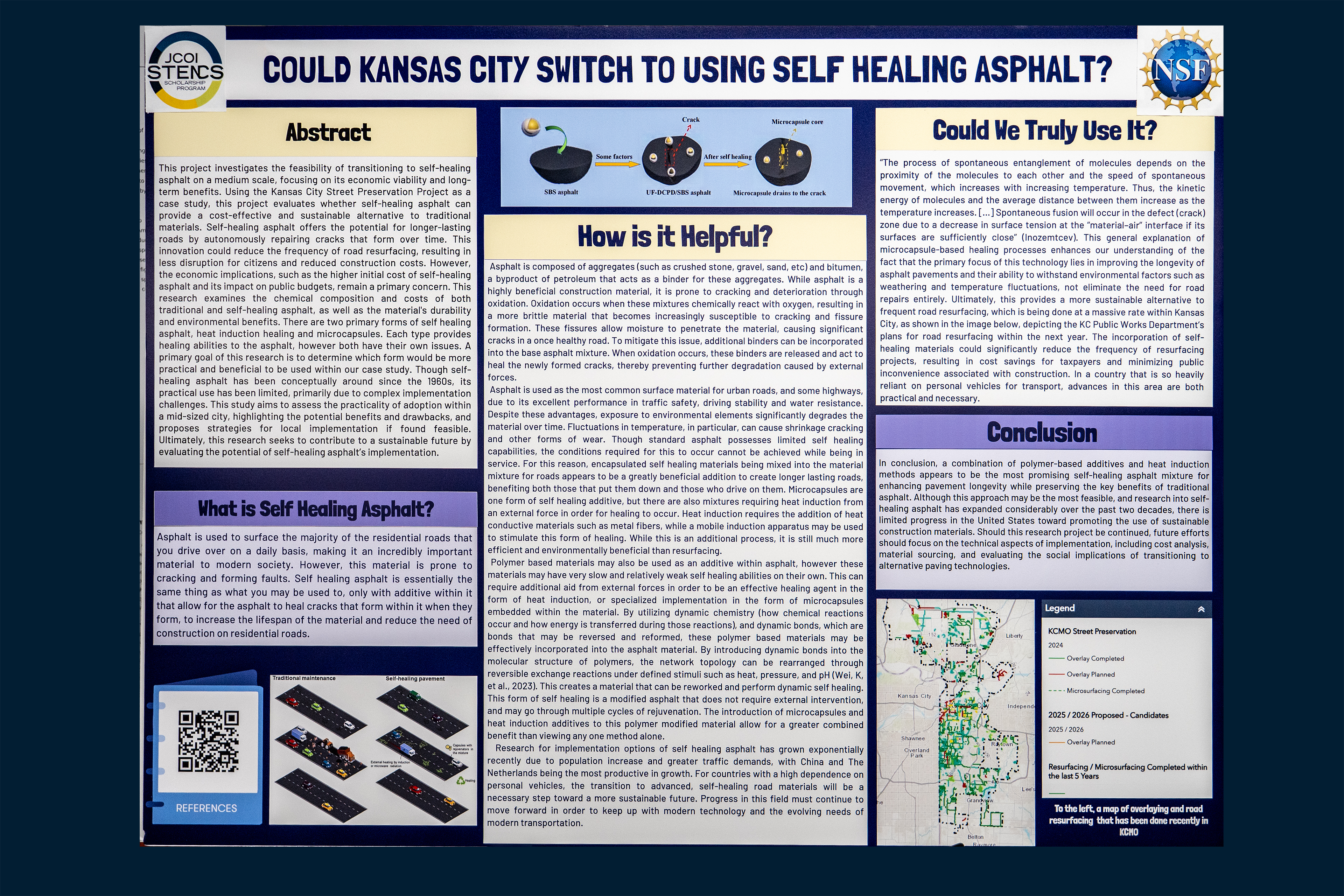 This project investigates the feasibility of transitioning to self-healing asphalt on a medium scale, focusing on its economic viability and long-term benefits. Using the Kansas City Street Preservation Project as a case study, this project evaluates whether self-healing asphalt can provide a cost-effective and sustainable alternative to traditional materials. Self-healing asphalt offers the potential for longer-lasting roads by autonomously repairing cracks that form over time. This innovation could reduce the frequency of road resurfacing, resulting in less disruption for citizens and reduced construction costs. However, the economic implications, such as the higher initial cost of self-healing asphalt and its impact on public budgets, remain a primary concern. This research examines the chemical composition and costs of both traditional and self-healing asphalt, as well as the material's durability and environmental benefits. There are two primary forms of self healing asphalt, heat induction healing and microcapsules. Each type provides healing abilities to the asphalt, however both have their own issues. A primary goal of this research is to determine which form would be more practical and beneficial to be used within our case study. Though self-healing asphalt has been conceptually around since the 1960s, its practical use has been limited, primarily due to complex implementation challenges. This study aims to assess the practicality of adoption within a mid-sized city, highlighting the potential benefits and drawbacks, and proposes strategies for local implementation if found feasible. Ultimately, this research seeks to contribute to a sustainable future by evaluating the potential of self-healing asphalt’s implementation.