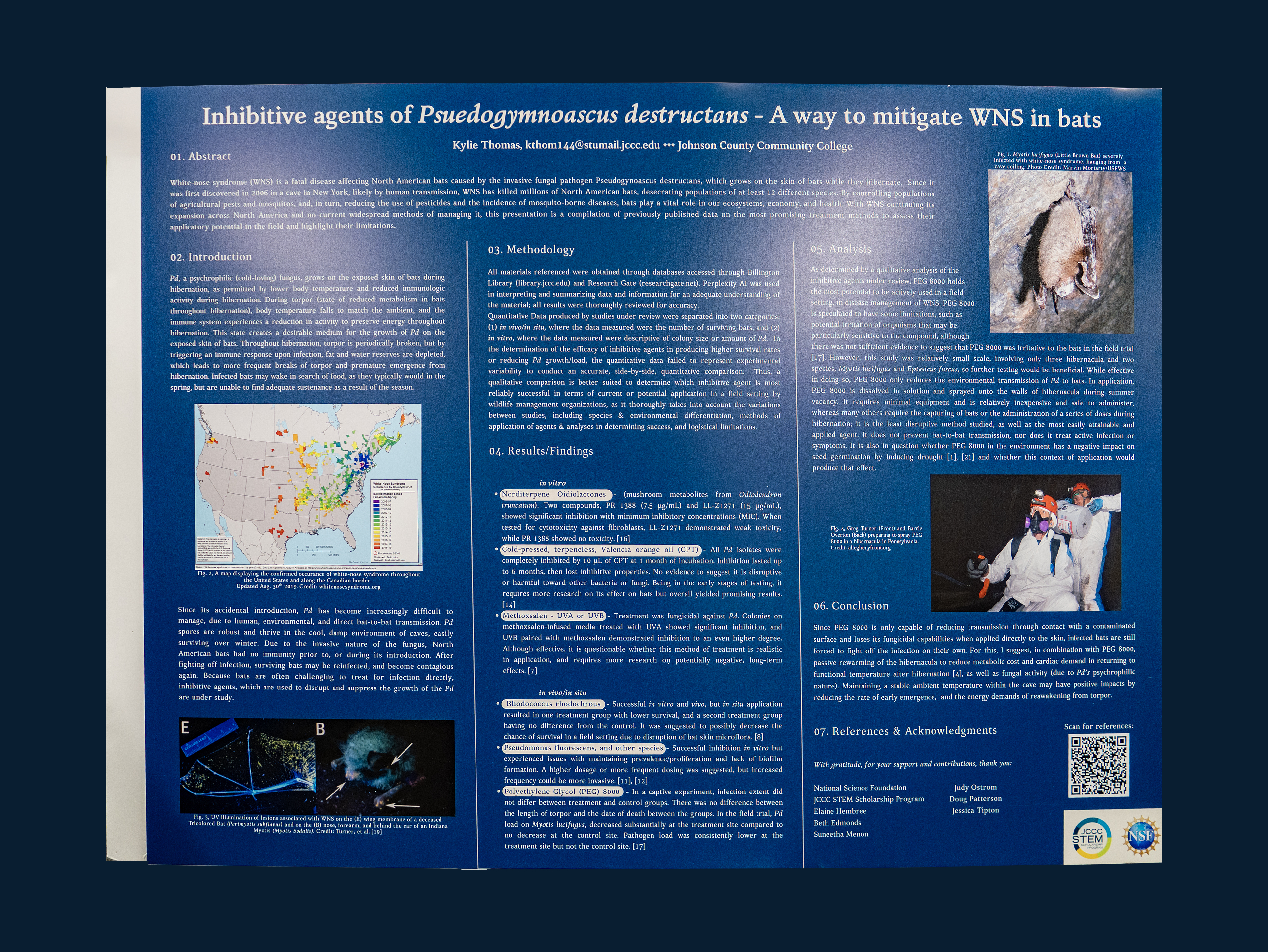 White-nose syndrome (WNS) is a fatal disease affecting North American bats caused by the invasive fungal pathogen Pseudogynoascus destructans, which grows on the skin of bats while they hibernate. Since it was first discovered in 2006 in a cave in New York, likely by human transmission, WNS has killed millions of North American bats, desecrating populations of at least 12 different species. By controlling populations of agricultural pests and mosquitos, and, in turn, reducing the use of pesticides and the incidence of mosquito-borne diseases, bats play a vital role in our ecosystems, economy, and health. With WNS continuing its expansion across North America and no current effective methods of managing it, this presentation is a compilation of previously published data on the most promising treatment methods to assess their applicatory potential in the field and highlight their limitations.