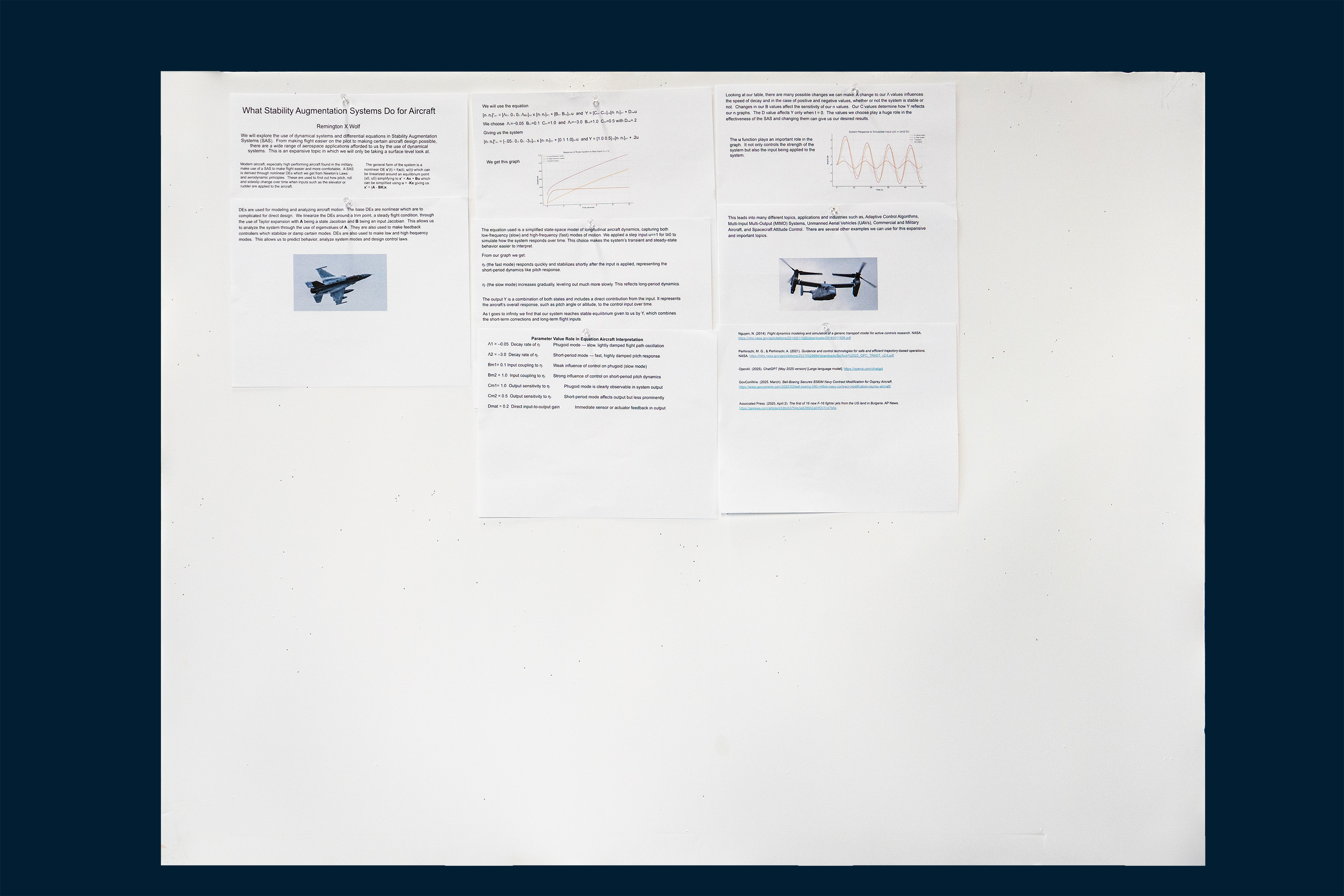 We will explore the use of dynamical systems and differential equations for stability systems found in aircraft. From making flight easier on the pilot to making certain aircraft designs possible, there are a wide range of aerospace applications afforded to us by the use of dynamical systems. This is an expansive topic that we will only be taking a surface-level examination of.