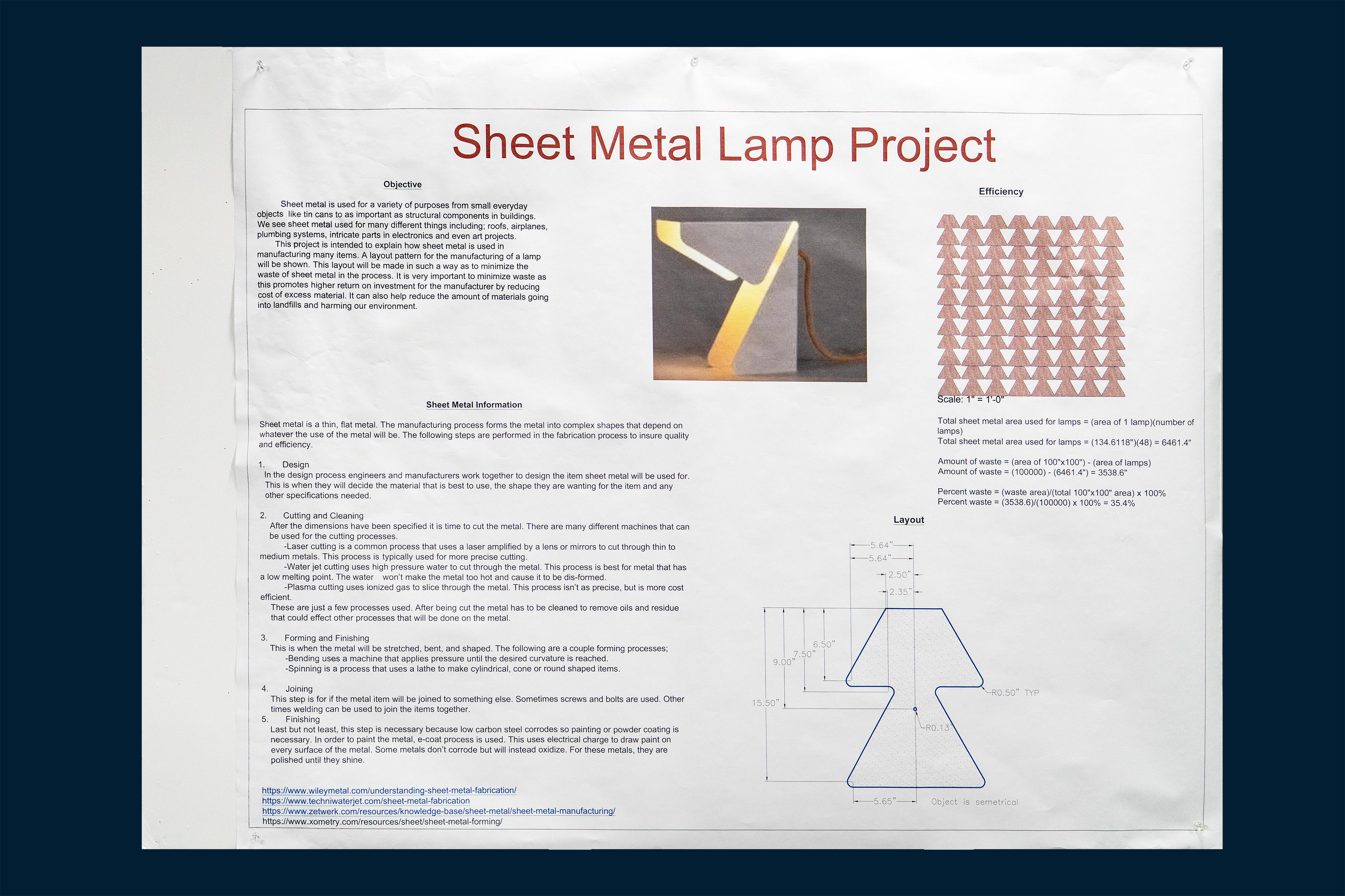 Sheet metal is used for a variety of purposes from small everyday objects like tin cans to as important as structural components in buildings. We see sheet metal used for many different things including; roofs, airplanes, plumbing systems, intricate parts in electronics and even art projects. This project is intended to explain how sheet metal is used in manufacturing many items. A layout pattern for the manufacturing of a lamp will be shown. This layout will be made in such a way as to minimize the waste of sheet metal in the process. It is very important to minimize waste as this promotes higher return on investment for the manufacturer by reducing cost of excess material. It can also help reduce the amount of materials going into landfills and harming our environment.