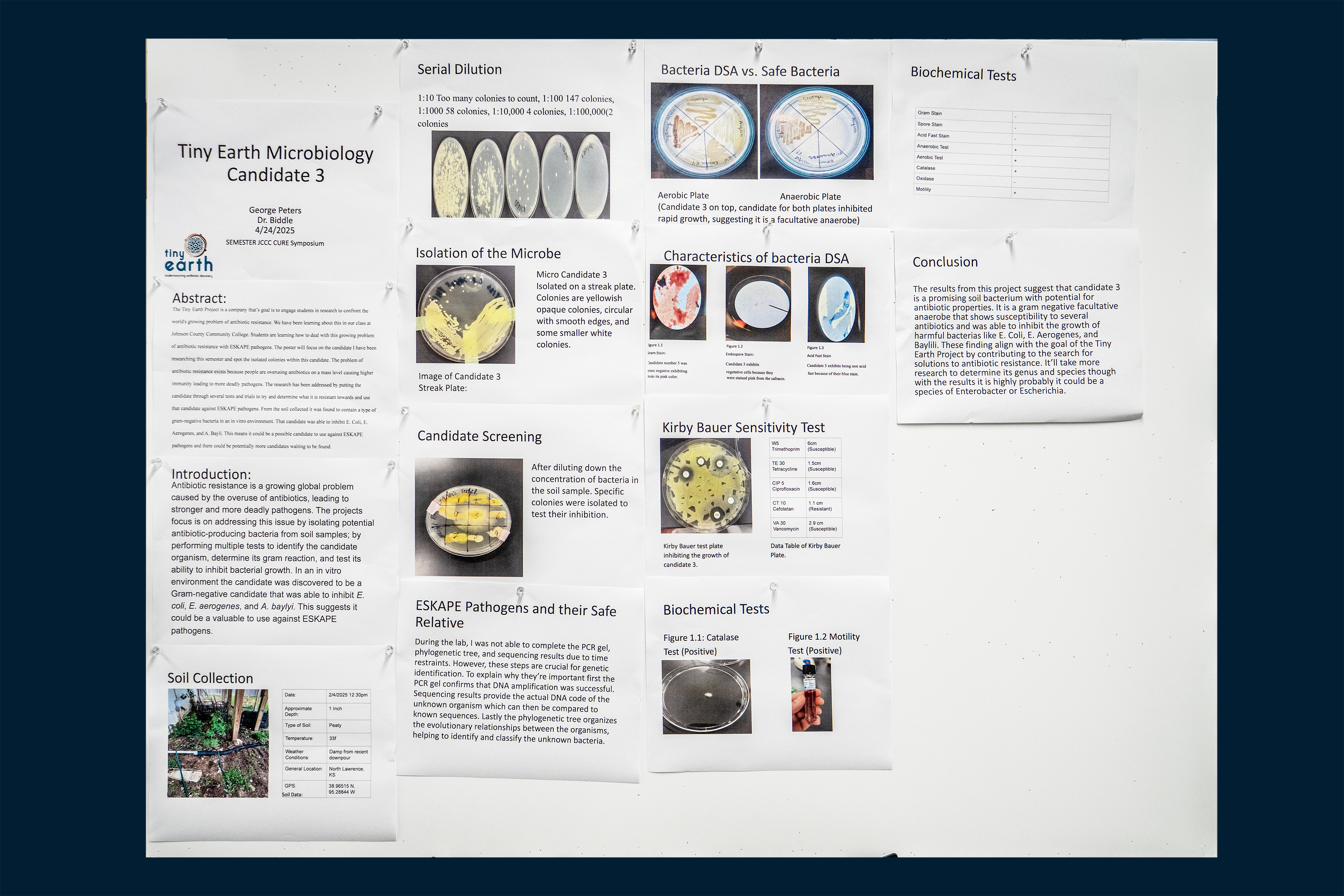 The Tiny Earth Project is a company that’s goal is to engage students in research to confront the worlds growing problem of antibiotic resistance. We have been learning about this in our class at Johnson County Community College. Students are learning how to deal with this growing problem of ESKAPE pathogens that are antibiotic resistant. The poster will focus's on the candidate I have been researching this semester and spotting the isolated colonies within the candidate. The problem of antibiotic resistance exists because people are overusing antibiotics on a mass level causing higher immunity leading to more deadly pathogens. The research has been addressed by putting the candidate through several tests and trials to try and determine what it is resistant towards and use that candidate against ESKAPE pathogens. From the soil collected it was found to contain a type of gram-negative bacteria in an in vitro environment. That candidate was able to inhibit E. Coli, E. Aerogenes, and A. Bayli. This means it could be a possible candidate to use against ESKAPE pathogens and there could be potentially more candidates waiting to be found.