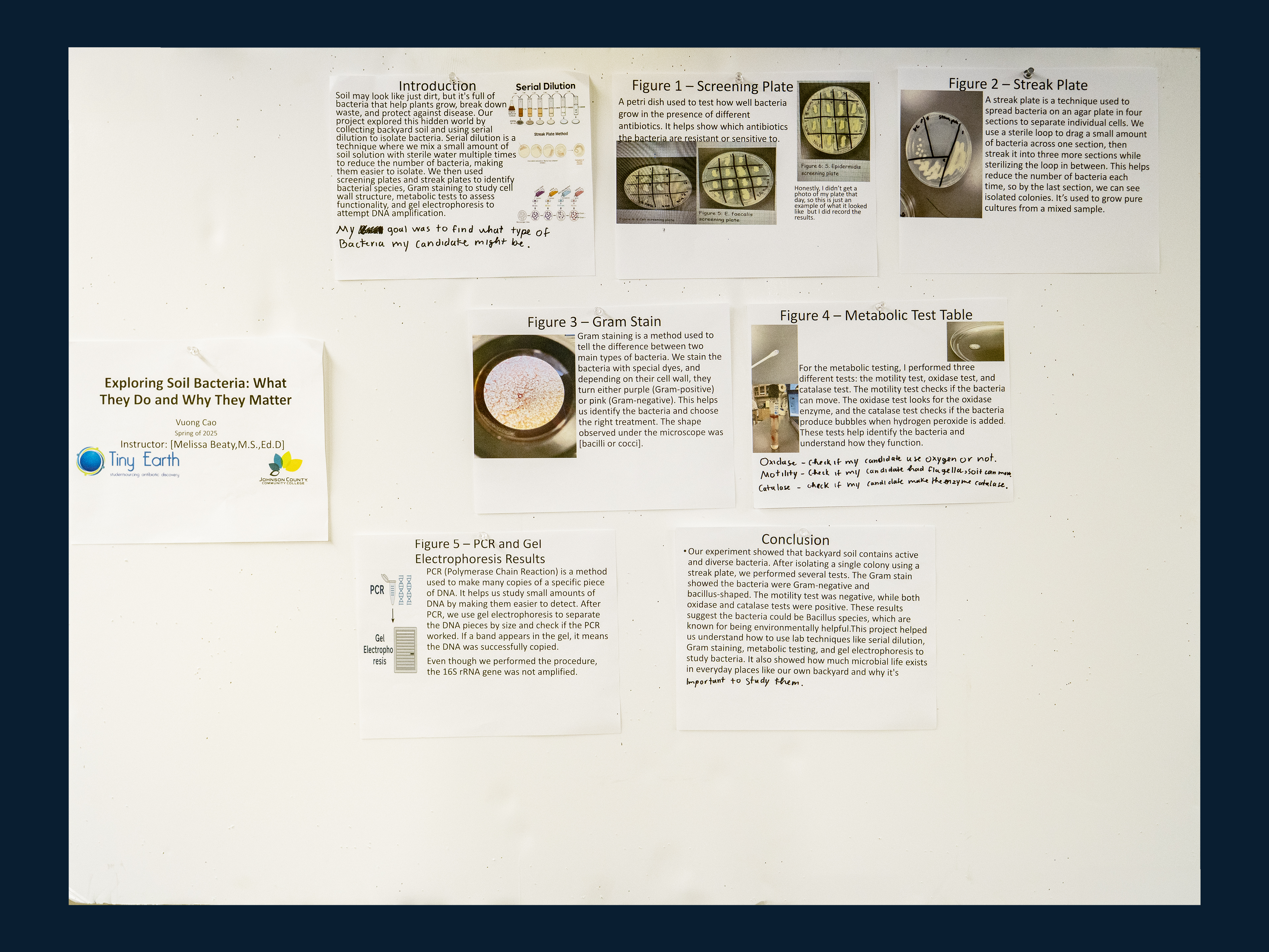 Exploring Soil Bacteria: What They Do and Why They Matter Many people think that if they drop food on the ground and pick it up quickly, it’s still clean. But that’s not true. Even a tiny bit of soil can have millions of bacteria in it. I recently got to test this in my lab class when I collected soil from my backyard. At first, it just looked like regular dirt, but when I used serial dilution to separate the bacteria and grow them on master plates, I saw how much life was actually in there. To learn more, I also used screening plates to check how they reacted to different conditions. One of the most exciting parts was using gel electrophoresis to study the substances they made, some of which could be helpful in medicine or farming. I found bacteria like Bacillus and Pseudomonas, which are known for keeping soil healthy and fighting off harmful bacteria. This experience changed how I see the soil. It’s not just dirt, it’s full of tiny living things that help plants grow, break down waste, and make valuable chemicals. By studying bacteria, we can learn more about how they help the world around us. What started as a simple backyard sample became an exciting way to understand the hidden world beneath our feet.