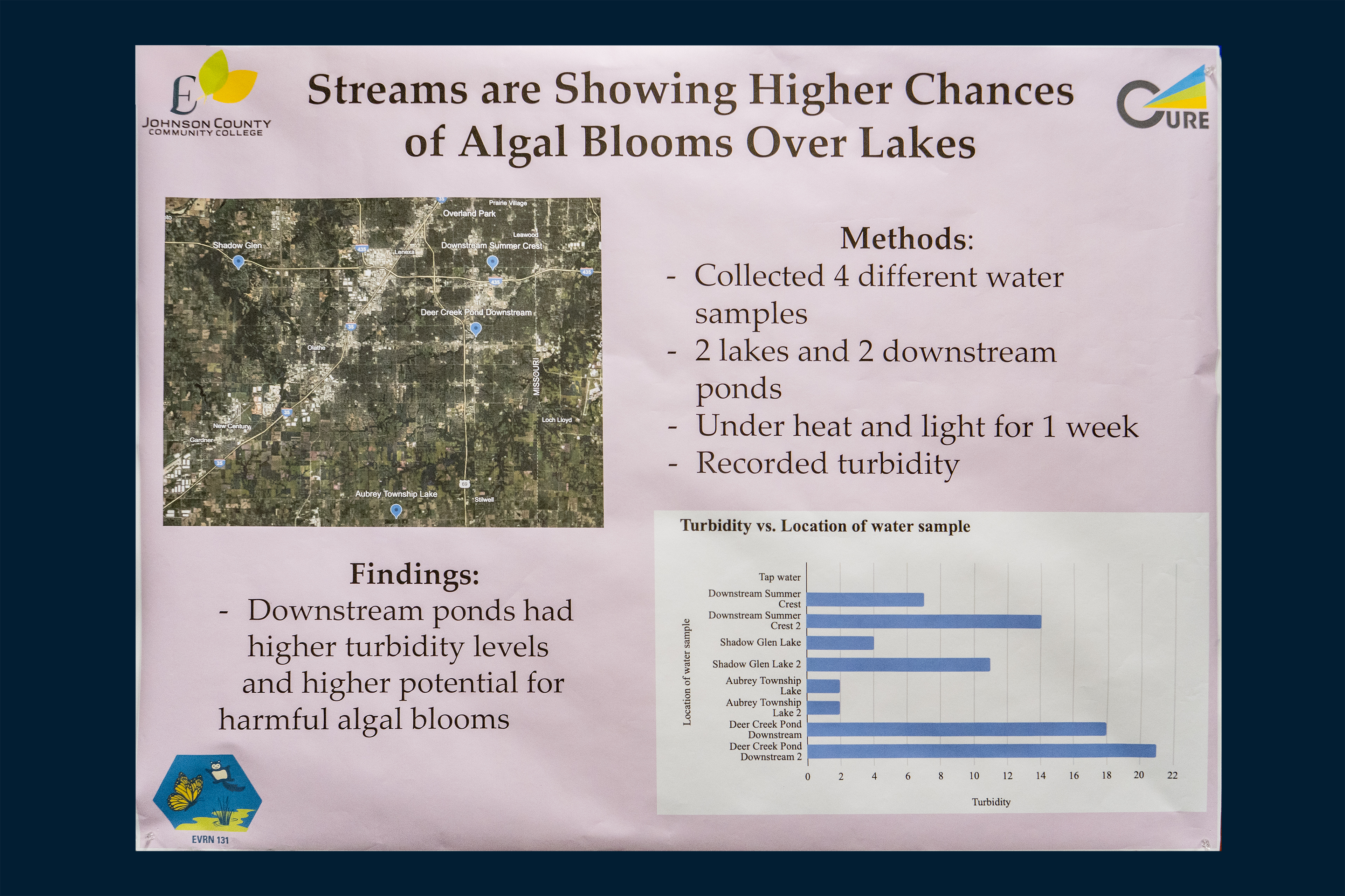 Our group has conducted an experiment with the purpose of determining if streams near lakes with HAB impact algae diversity. We took samples of water from downstream ponds and different lakes and set them under a heat lamp for a week. In the end, we measured the turbidity of each sample to determine the algae growth.