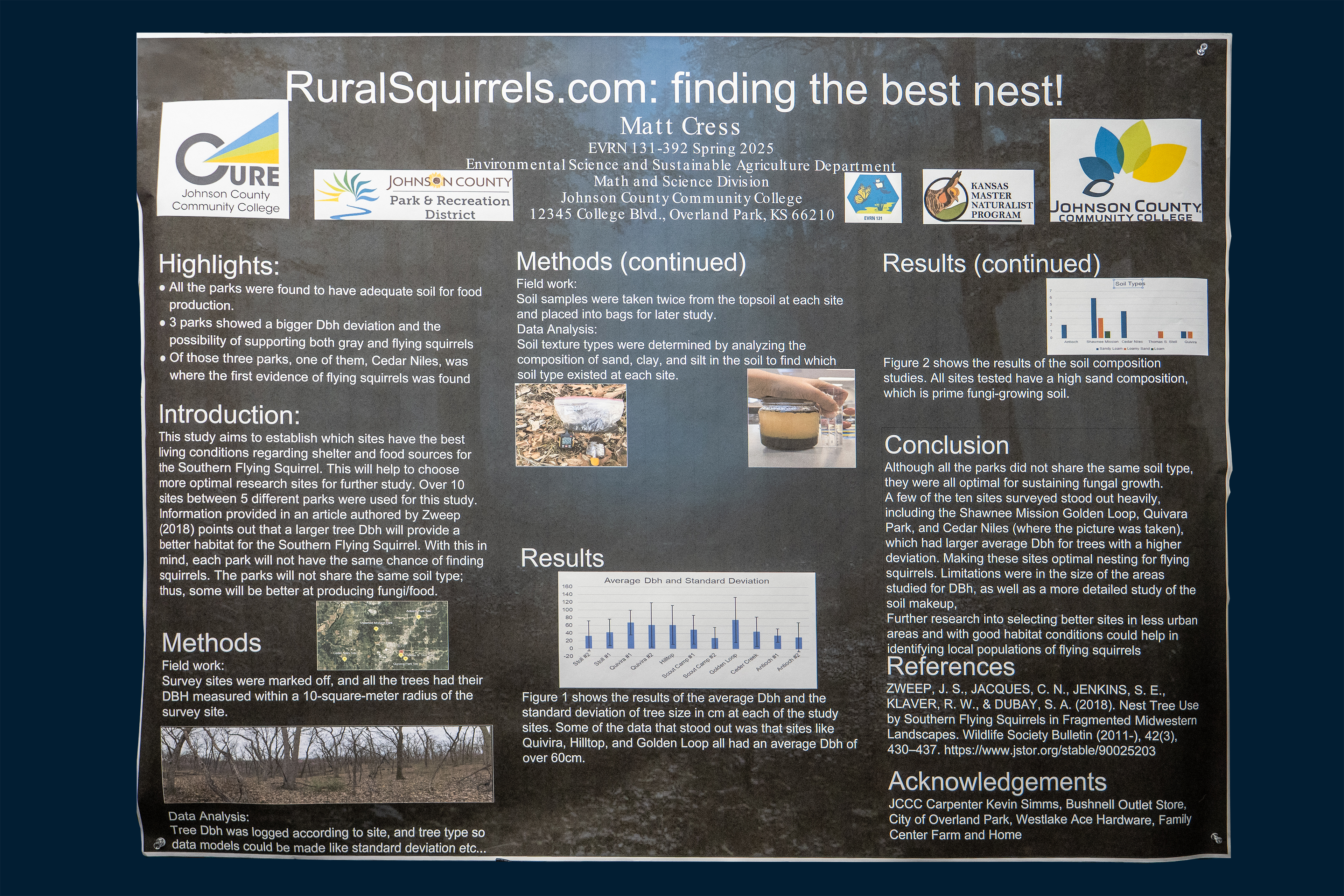 The research project attempts to locate the most ideal living conditions for southern flying squirrels, by prioritizing specific elements such as food and shelter that are key in their choice of habitat. Justification for the study lies in the need to establish an understanding of the importance of these habitat preferences and requirements in the sites that are monitored, in regards to increasing the chances of identification. The research methods incorporate a multifaceted approach with, the use of soil samples to measure fungal counts and the amount of food supply available, and the meticulous measurement of tree sizes and opening diameters for the use of nesting sites that are less susceptible to competition and the effects of weather. These natural variables are regarded to be clear indicators of prime habitat for the southern flying squirrel. In the end the project expects to identify the precise sites that exhibit these most optimal living conditions and would be expected to have a higher likelihood of sustaining southern flying squirrels, thus allowing for more valuable insight for future research into the existence of southern flying squirrels in Kansas.