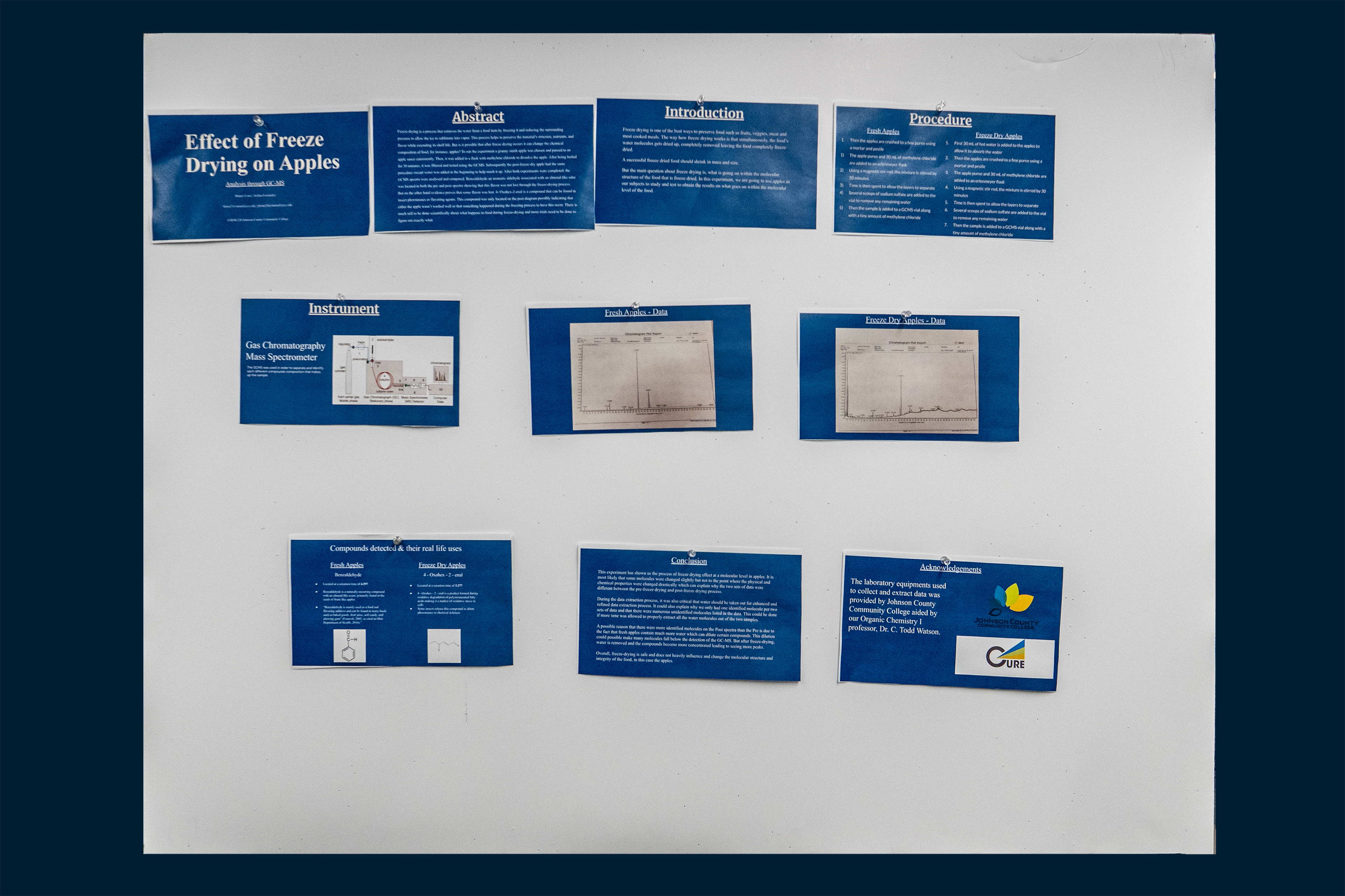 Freeze drying is a process that removes the water from a food item by freezing it and reducing the surrounding pressure to allow the ice to sublimate into vapor. This process helps to preserve the material’s structure, nutrients, and flavor while extending its shelf life. But is it possible that after freeze drying occurs it changes the chemical composition of food, for instance, apples? To run the experiment a granny smith apple was chosen and pureed to an apple sauce consistently. Then, it was added to a flask with methylene chloride to dissolve the apple. After being boiled for 30 minutes, it was filtered and tested using the GCMS. Subsequently the post-freeze-dry apple had the same procedure except water was added at the beginning to help mush it up. After both experiments were completed, the GCMS spectra were analyzed and compared. Benzaldehyde an aromatic aldehyde associated with an almond-like odor was located in both the pre and post spectra showing that this flavor was not lost through the freeze-drying process. But on the other hand evidence proves that some flavor was lost. 4- Oxohex-2-enal is a compound that can be found in insect pheromones or flavoring agents. This compound was only located on the post diagram possibly indicating that either the apple wasn’t washed well or that something happened during the freezing process to have this occur. There is much still to be done scientifically about what happens to food during freeze-drying and more trials need to be done to figure out exactly what.