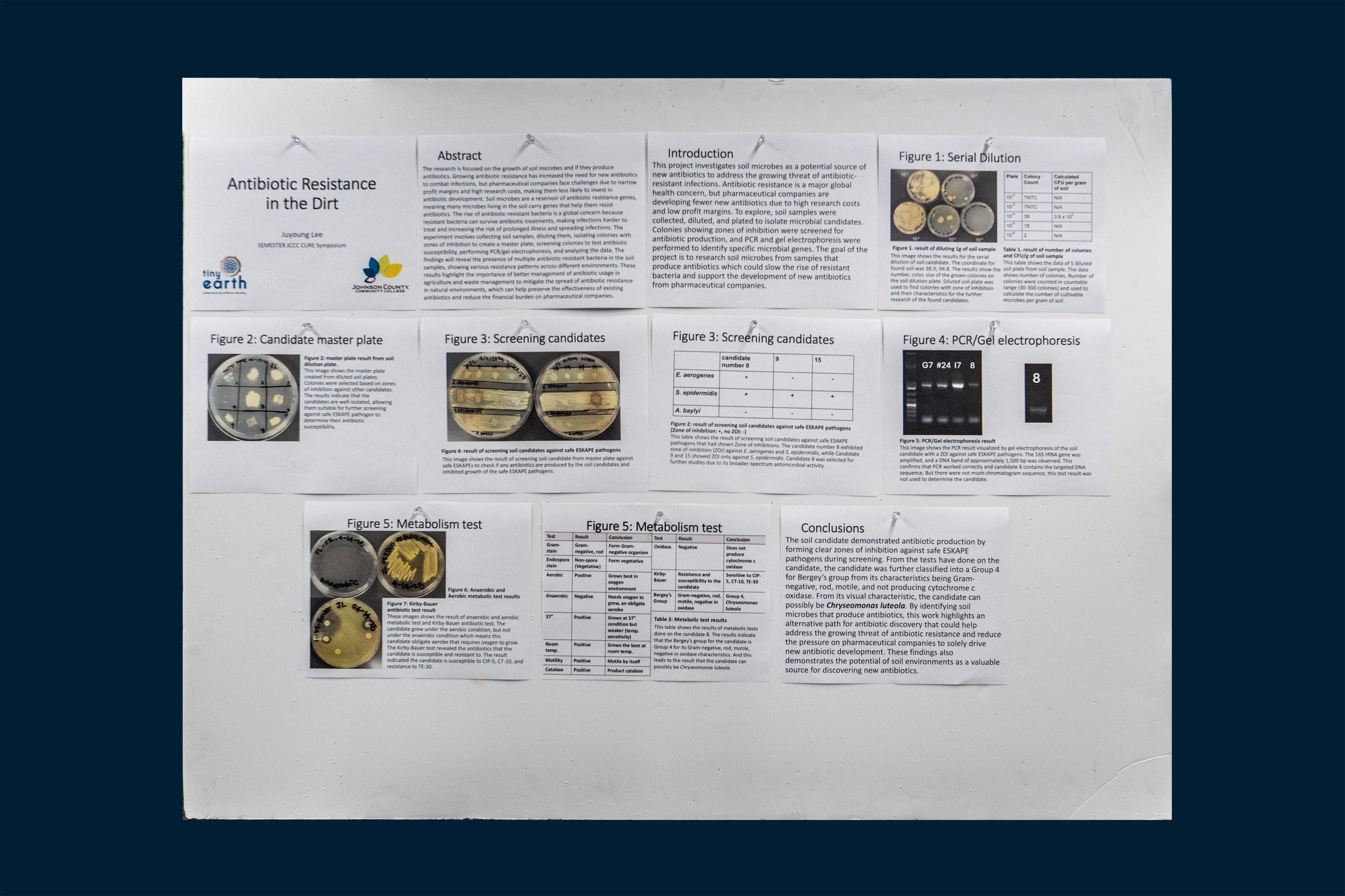 The research for the 2025 Tiny Earth poster symposium is focused on the cultivation (growth) of soil microbes and their resistance to antibiotics. Growing antibiotic resistance has increased the need for new antibiotics to combat infections, but pharmaceutical companies face challenges due to narrow profit margins and high research costs, making them less likely to invest in antibiotic development. Soil microbes are a reservoir of antibiotic resistance genes, meaning many microbes living in the soil carry genes that help them resist antibiotics. The rise of antibiotic-resistant bacteria is a global concern because resistant bacteria can survive antibiotic treatments, making infections harder to treat and increasing the risk of prolonged illness and spreading infections. The experiment involves collecting soil samples, diluting them, isolating colonies with zones of inhibition to create a master plate, screening colonies to test antibiotic susceptibility, performing PCR/gel electrophoresis, and analyzing the data. The findings will reveal the presence of multiple antibiotic-resistant bacteria in the soil samples, showing various resistance patterns across different environments. These results highlight the importance of better management of antibiotic usage in agriculture and waste management to mitigate the spread of antibiotic resistance in natural environments, which can help preserve the effectiveness of existing antibiotics and reduce the financial burden on pharmaceutical companies.