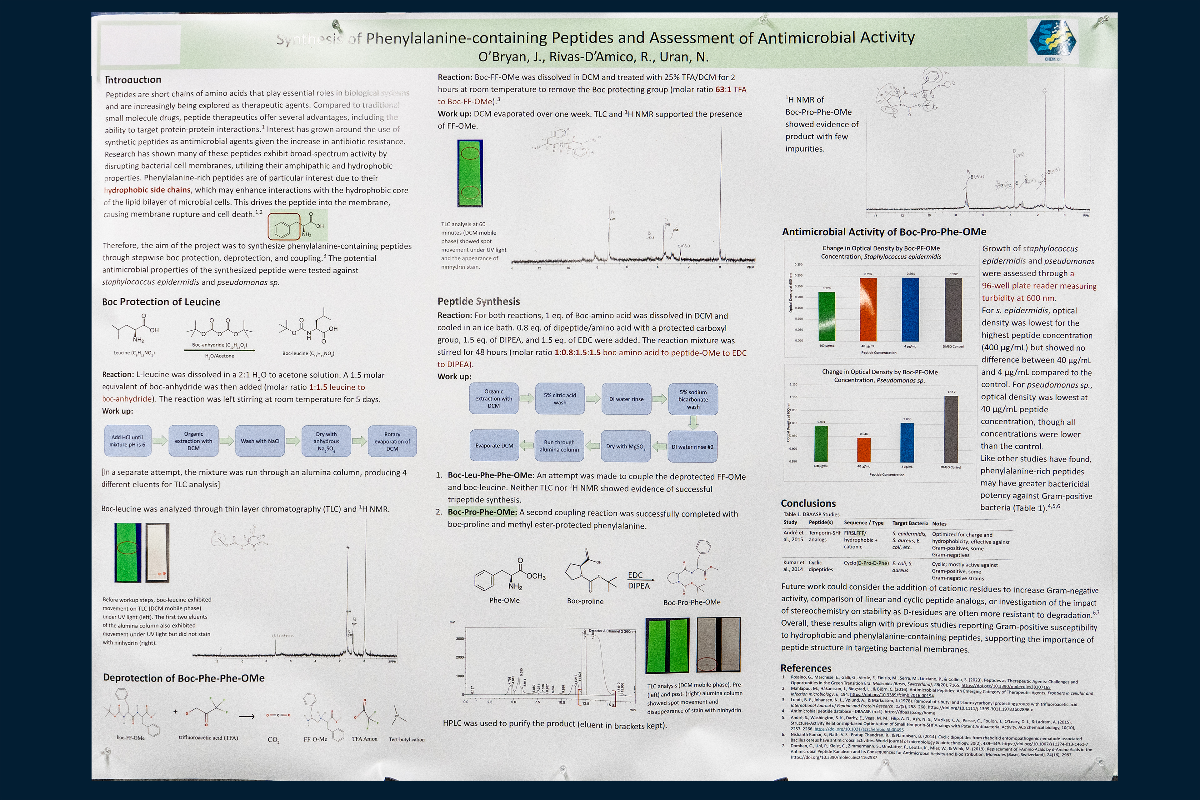 This research project aims to synthesize and evaluate a tripeptide for potential antimicrobial properties. Since current research suggests peptide hydrophobicity is linked to bacterial membrane disruption, a tripeptide composed of leucine and phenylalanine will be synthesized. This will be achieved through stepwise protection, deprotection, and coupling of amino acids. First, the amine group of the amino acid leucine will be Boc-protected, a strategy in peptide synthesis where a tert-butyloxycarbonyl (Boc) group shields reactive sites to control selectivity. Meanwhile, the Boc-protected dipeptide Boc-FF-OMe, which has a methyl ester-protected carboxyl group, will be deprotected using TFA to expose its free amine. The conditions and work-up steps for each reaction will be developed by this group. The progress of each reaction will be monitored by thin layer chromatography. Finally, the deprotected dipeptide will be coupled to Boc-Leu using EDC-mediated coupling, forming the protected final product, Boc-LFF-OMe. Structural characterization of the protected amino acid, deprotected dipeptide, and final product will be confirmed by ¹H NMR spectroscopy. The synthesized tripeptide will be evaluated for antimicrobial activity by growth inhibition assay. This project provides insight into peptide synthesis techniques and their potential applications in antimicrobial research.