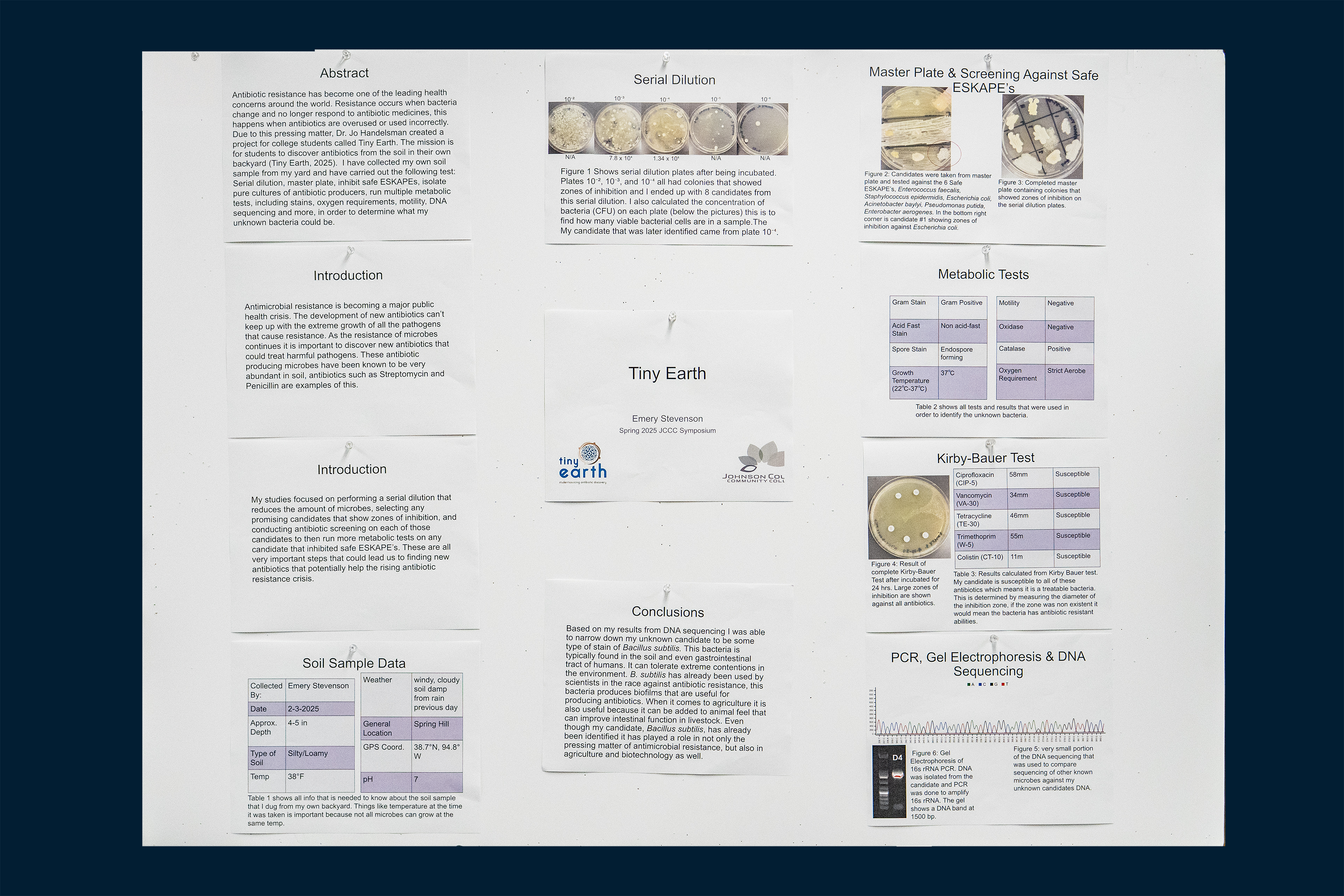Antibiotic resistance has become one of the leading health concerns around the world. Resistance occurs when bacteria change and no longer respond to antibiotic medicines, this happens when antibiotics are overused or used incorrectly. Due to this pressing matter, Dr. Jo Handelsman created a project for college students called Tiny Earth. The mission is for students to discover antibiotics from the soil in their own backyard (Tiny Earth, 2025). I have collected my own soil sample from my yard and have begun carrying out the steps. This includes serial dilution, master plate, inhibit safe ESKAPEs, isolate pure cultures of antibiotic producers. I have yet to be able to isolate any antibiotic producers that inhibit safe ESKAPEs, this means that my soil sample does not have any antibiotic producing microbes. By finding these potential microbes, we are actively looking for more natural antibiotics to bacteria.