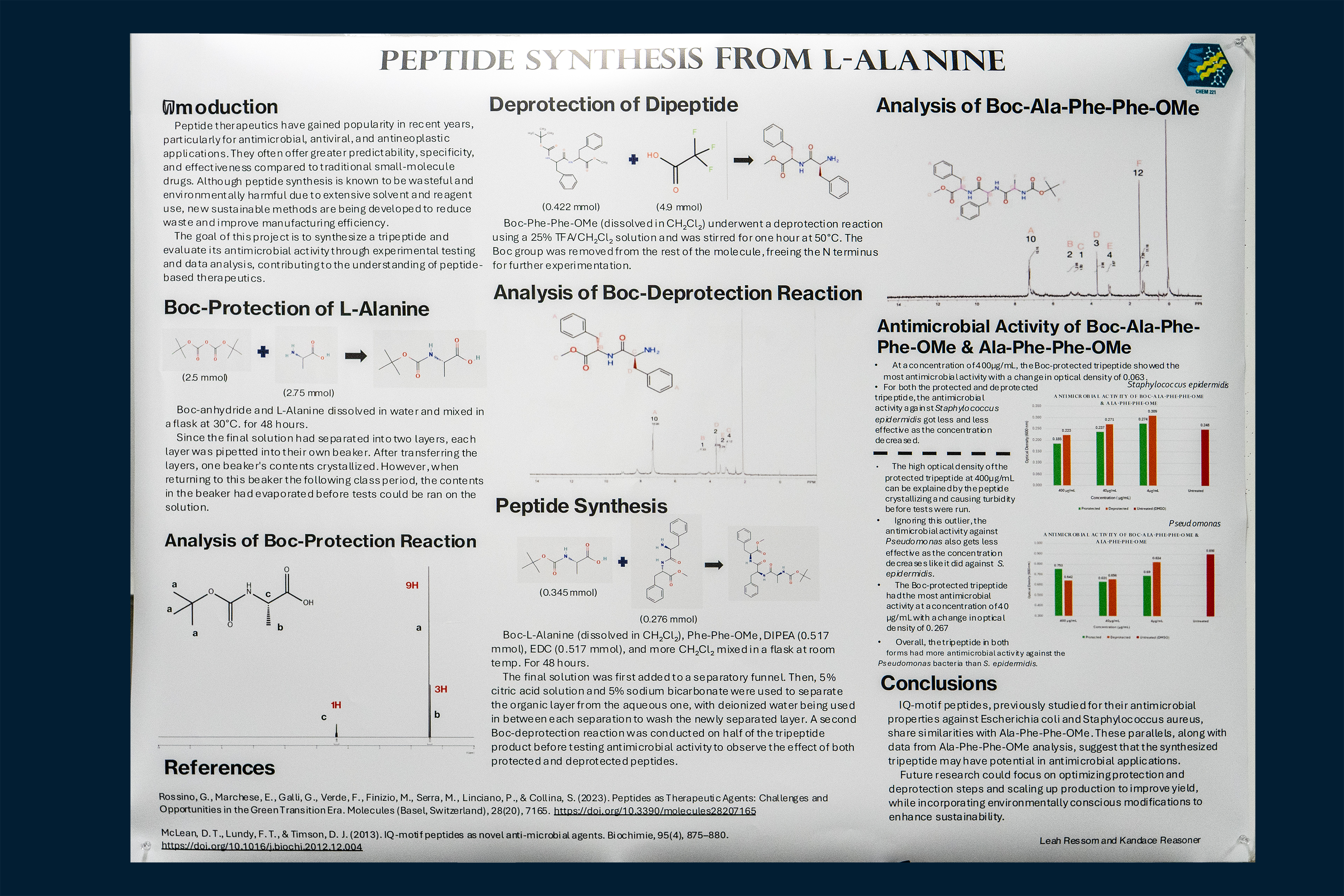 Current research indicates that peptides with hydrophobic and/or an overall positive charge usually have some antimicrobial activity. The goal of this CURE project is to synthesize peptides that are 2-3 amino acids long and are antimicrobial. When forming the desired peptide bond, protecting groups need to be used so that unwanted side-reactions with the free amino and carboxylic acid groups of each reactant don't occur. D-Alanine will have the amine group protected by a BOC group, leaving the carboxylic acid free to react. BOC-FF-OMe will have its BOC group removed and its carboxylic acid protected with an ester, leaving the amine group free to react. Both reactions will be monitored by TLC to determine if the product has formed. In the final reaction, the peptide bond will be formed using EDC as a coupling reagent. The protected amino acid products and the final peptide product will be analyzed by 1H NMR to determine the structure and purity. Additionally, any antimicrobial activity will be evaluated by growth inhibition assay using optical density measurement at 600 nm.