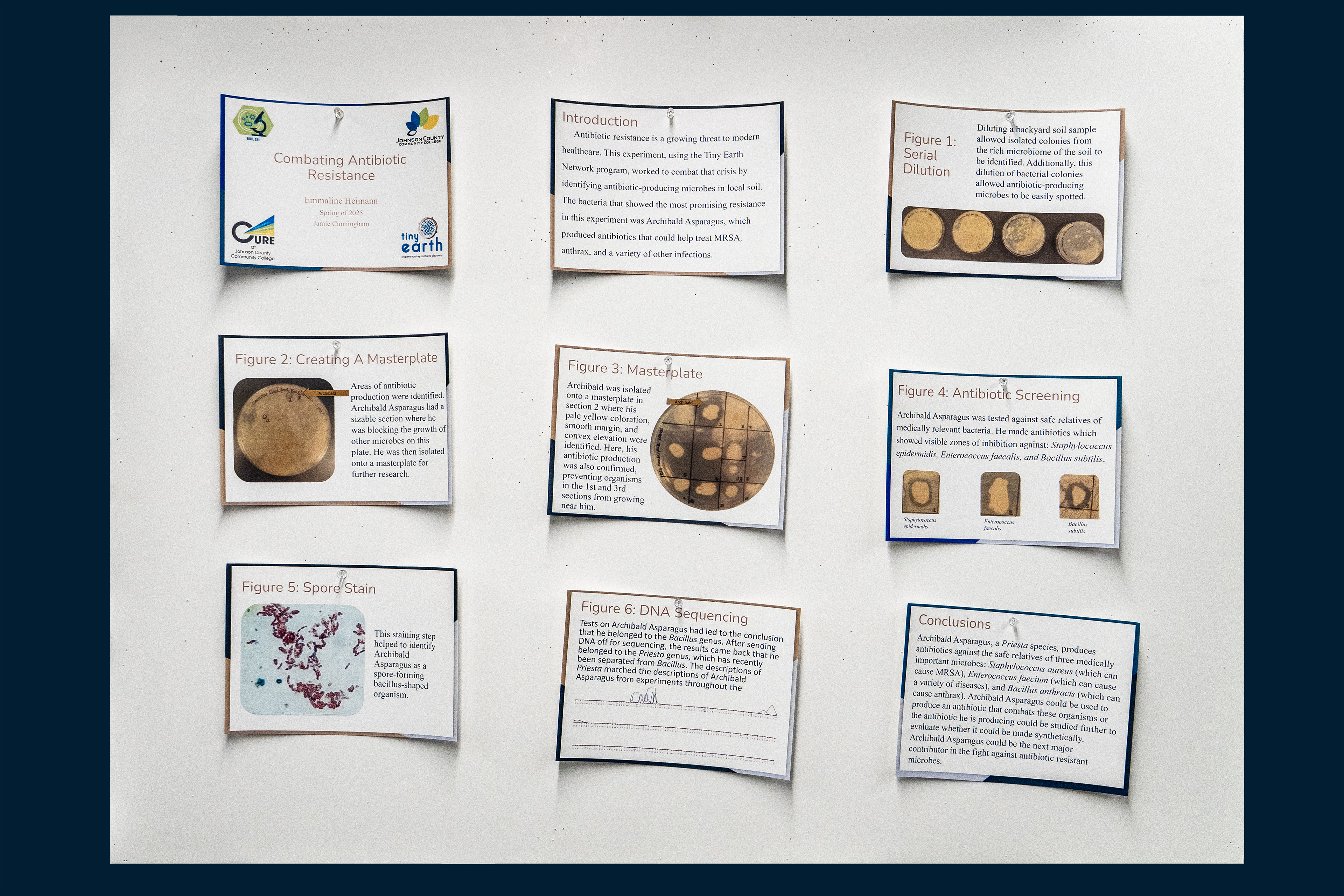 Antibiotic resistance is a growing threat in the modern world. Over the past hundred years, bacteria have evolved to evade the destruction of the antibiotics we currently use. This is incredibly dangerous because it can leave people without hope of recovery for what have been easily treatable diseases for decades. This will continue to be an issue unless new antibiotics are found. In response to this growing threat, programs such as the Tiny Earth Network and the Small World Initiative have chosen to take action, allowing students to find solutions to this growing problem. This experiment, using the Tiny Earth Network program, found antibiotic-producing microbes in local soil. Many of these bacteria showed antibiotic production with zones of inhibition against organisms closely related to many medically important bacteria. The bacteria that showed the most promising resistance, which I named Archibald Asparagus, showed sizable zones of inhibition against safe relatives of the bacteria: Staphylococcus aureus (which can cause MRSA), Enterococcus faecium (which can cause a variety of infections), and Bacillus anthracis (which can cause anthrax). This discovery along with the research of others around the world could slow the progression of the antibiotic resistance crisis.