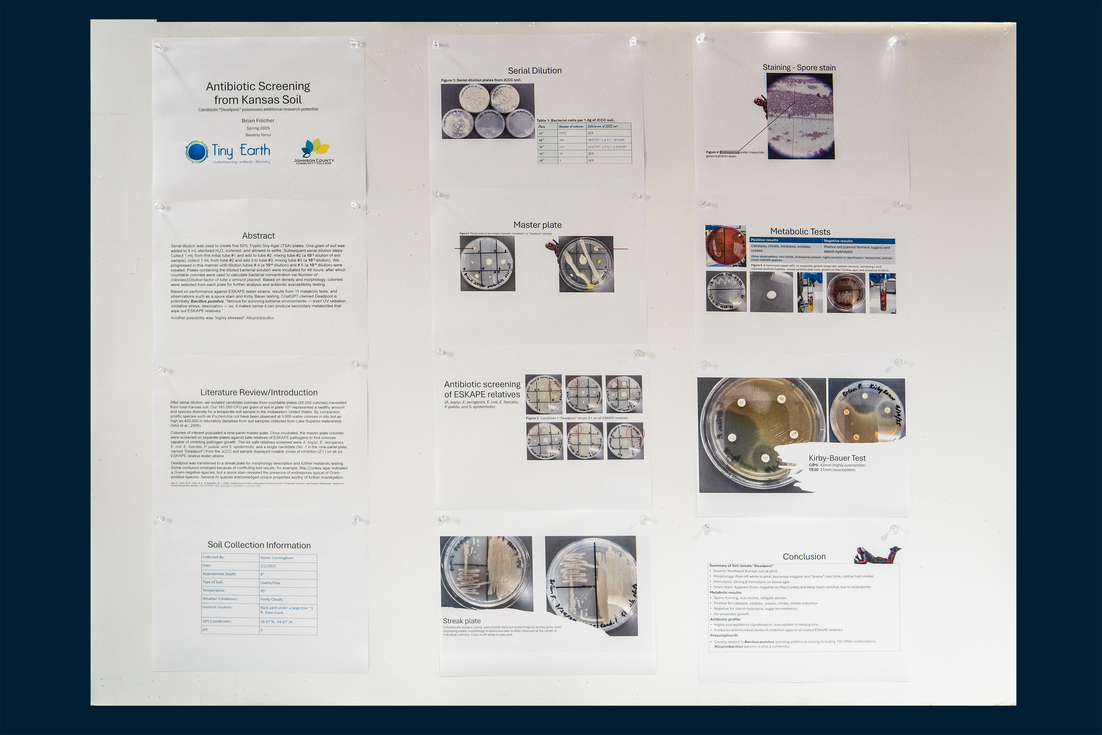 Antibiotic screening was performed using isolated bacterial candidates derived from rural northeast Kansas soil samples. The objective was identification of nine bacterial candidates per soil sample (18 total) that showed zones of inhibition against the tester strains of ESKAPE pathogen safe relatives. Standard laboratory screening methods were employed, including the use of a Bacti-cinerator, cotton swabs, inoculating loops, safe relatives of ESKAPE pathogens, 50% TSA plates, a room temperature incubator, and master plates of each soil sample’s candidates. ESKAPE safe relatives tested include Escherichia coli, Staphylococcus epidermidis, Pseudomonas putida, Enterobacter aerogenes, Enterococcus faecalis, and Acinetobacter baylyi. One sample (“Individual”) produced no noteworthy specimens, while the second sample (“JCCC”) produced one candidate – Candidate 1, or “Deadpool” – that was effective against all six ESKAPE safe relatives (tester strains).