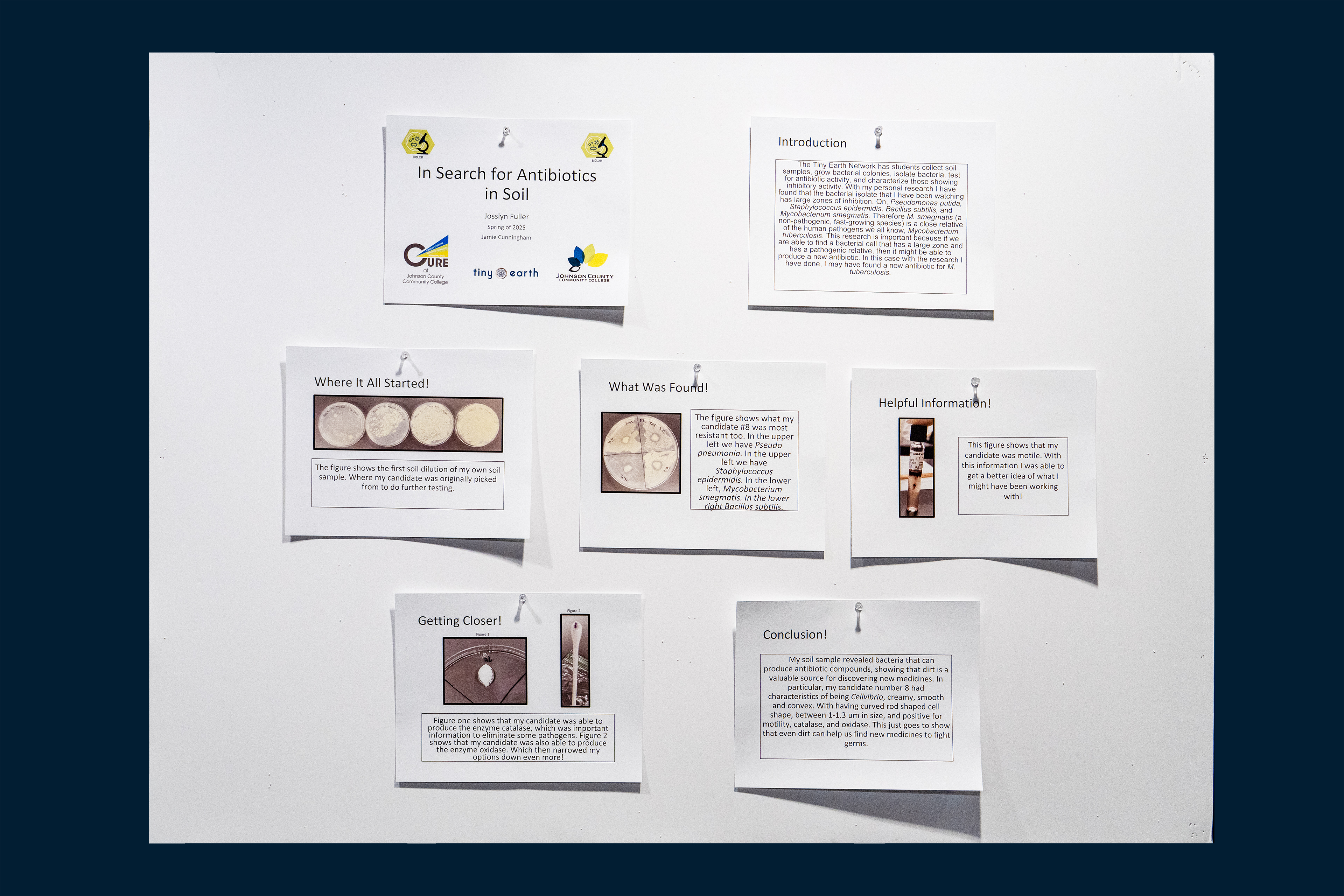 The Tiny Earth Network has students collect soil samples, grow bacterial colonies, isolate bacteria, test for antibiotic activity, and characterize those showing inhibitory activity. With my personal research I have found that the bacterial isolate that I have been watching has large zones of inhibition. on, Pseudomonas putida, Staphylococcus epidermidis, Bacillus subtilis, and Mycobacterium smegmatis. Therefore M. smegmatis (a non-pathogenic, fast-growing species) is a close relative of the human pathogens we all know, Mycobacterium tuberculosis. This research is important because if we are able to find a bacterial cell that has a large zone and has a pathogenic relative, then it might be able to produce a new antibiotic. In this case with the research I have done, I may have found a new antibiotic for M. tuberculosis.