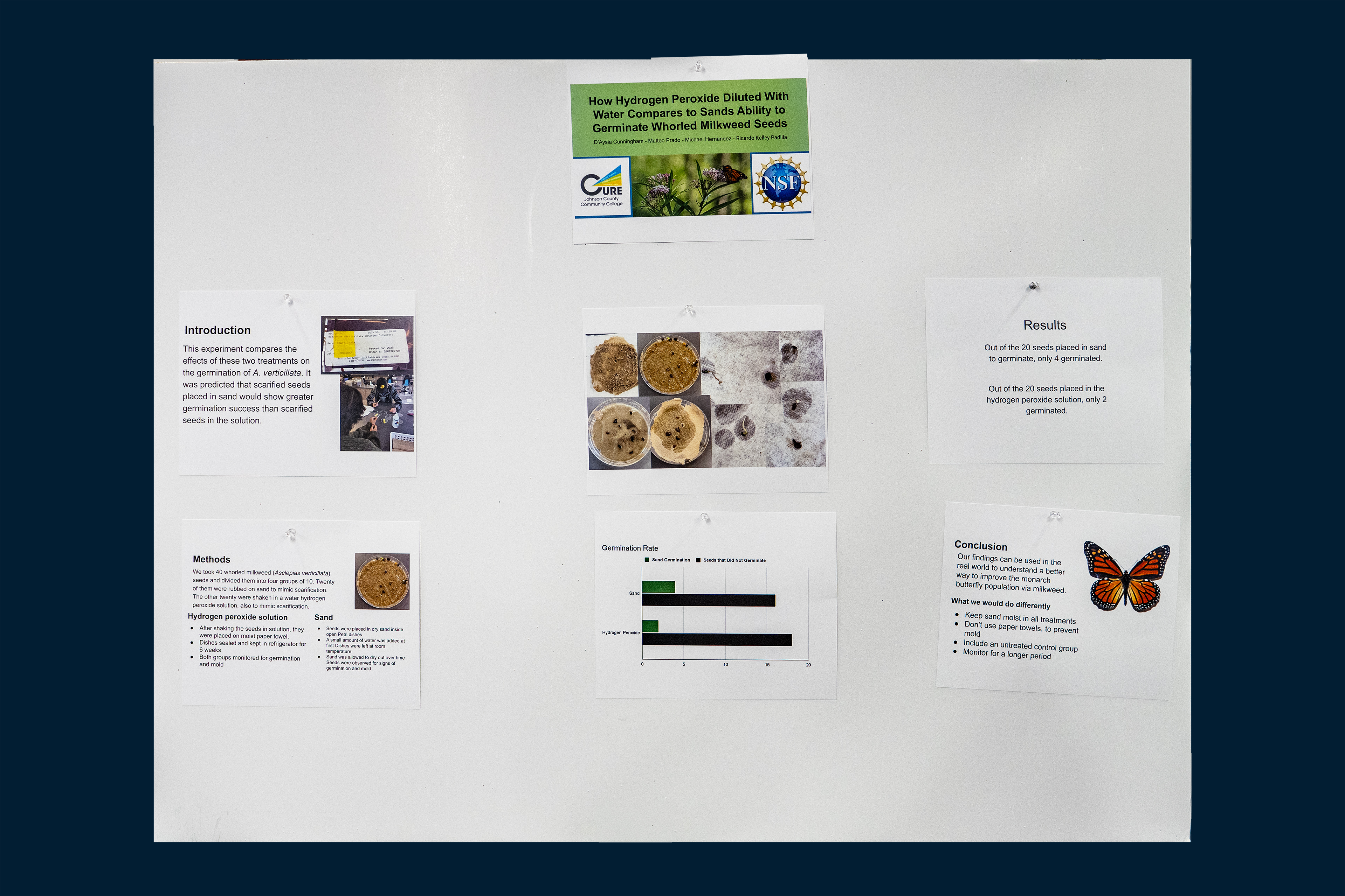 This helps the problem of there not being enough milkweed for the monarch butterflies. By having more milkweed plants, that offers more resources for the population of monarch butterflies to grow. Milkweed seeds were placed in different environments to see how the germination process would be affected. Meant to find if there is a more optimal way to get milkweed seeds to germinate. By finding this it can be implemented in the real world in planting milkweed seeds. 20 milkweed seeds were placed in sand and water and another 20 milkweed seeds into hydrogen peroxide and water solution on a brown paper towel inside petri dishes. The sand and the hydrogen peroxide solution were used for stratification. The seeds sat for 6 weeks. The findings show that hydrogen peroxide is not a good environment for germination. Sand makes for a better environment but still is not the most optimal. In the future, it would be helpful to use a larger sample size and environment for the seeds. Overall, the sand showed more promising results and can be considered in the future.