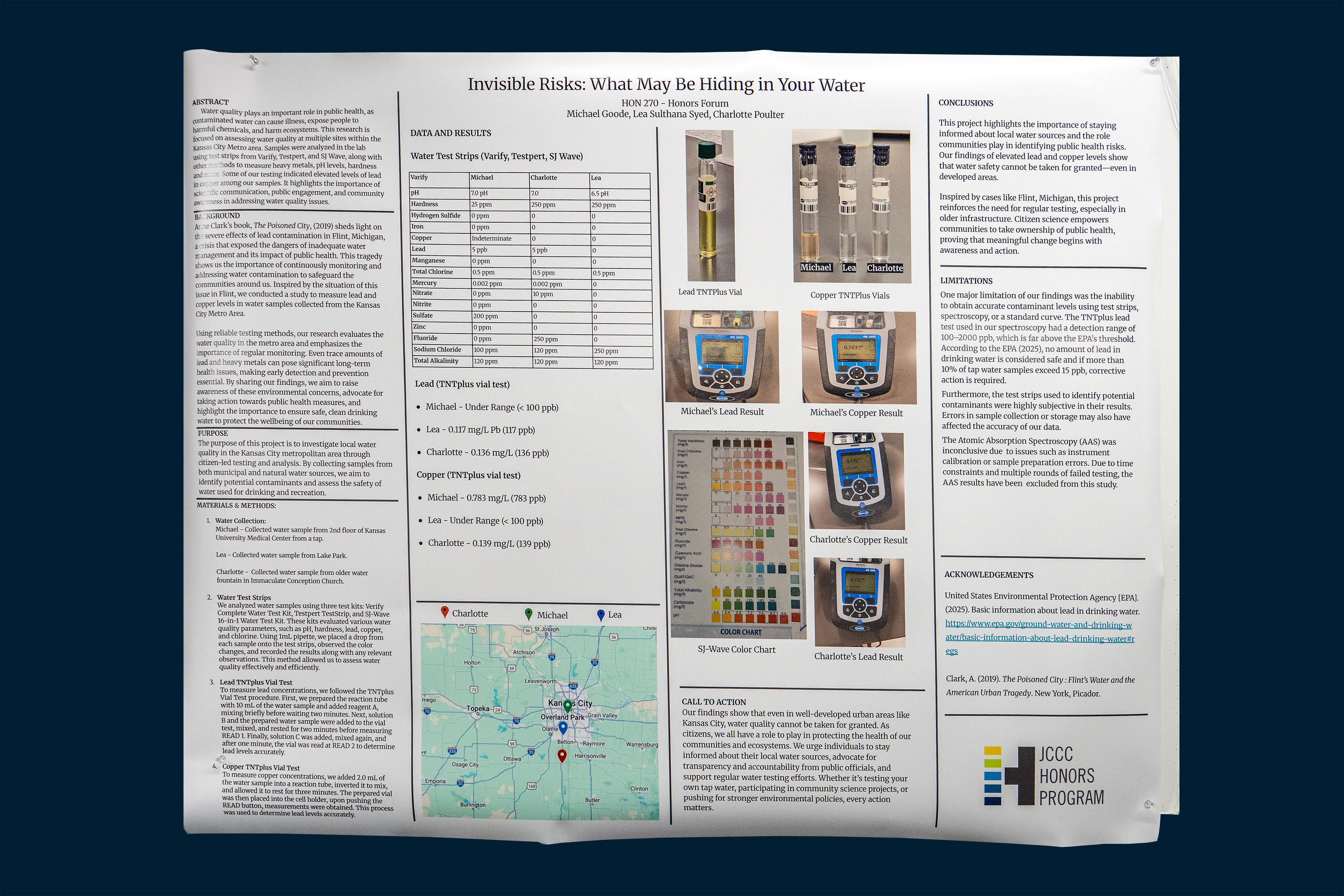Water quality plays an important role in public health, as contaminated water can cause illness, expose people to harmful chemicals, and harm ecosystems. This research is focused on assessing water quality at multiple sites within the Kansas City Metro area. Samples were analyzed in the lab using testing strips (Varify, Testpert, and SJ Wave) and other methods to measure heavy metals, pH levels, hardness, and more. Our results showed elevated Lead levels, along with traces of other metals. It highlights the importance of scientific communication, public engagement, and community awareness in addressing water quality issues.