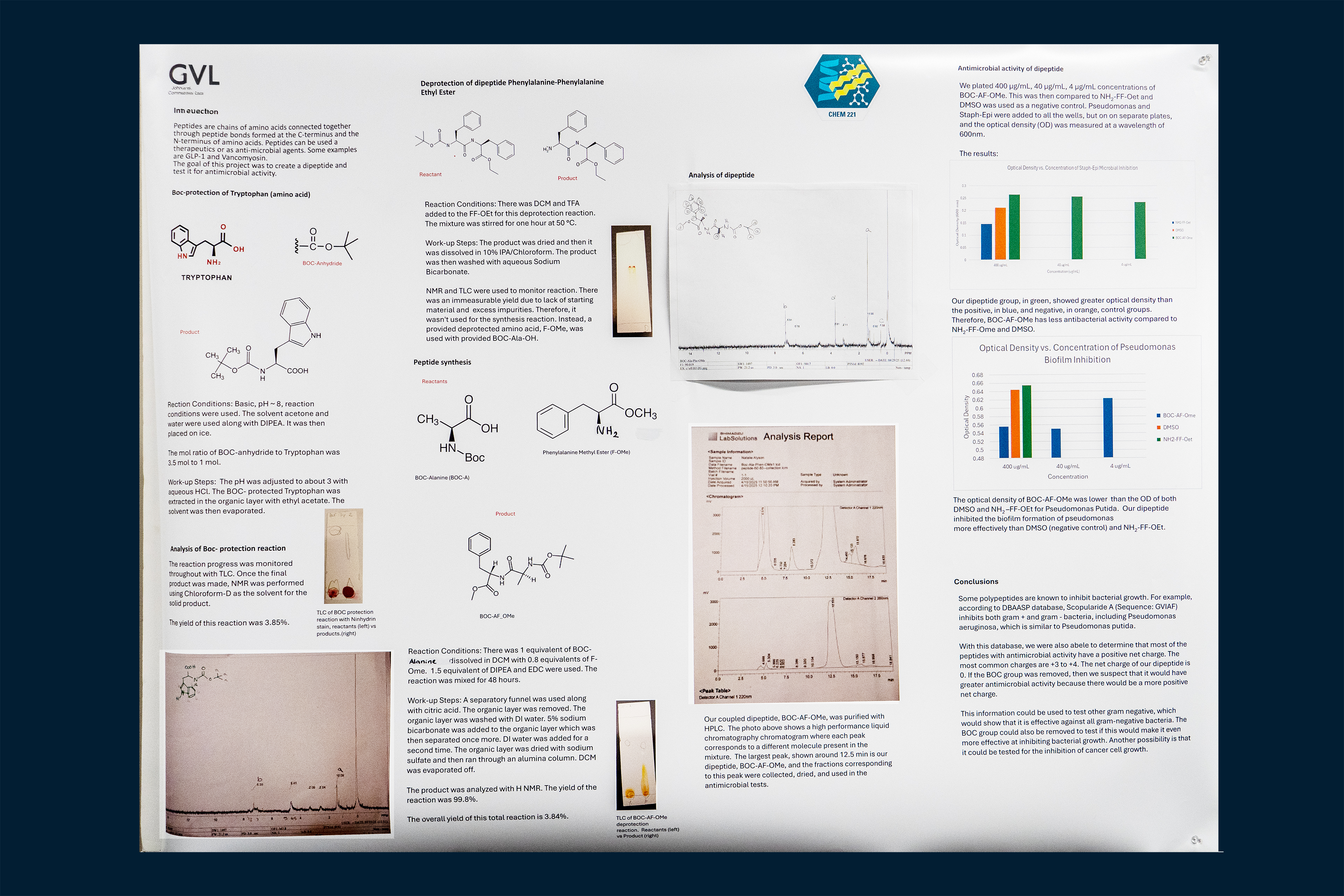 For this CURE project, a peptide bond will be formed by joining tryptophan with another amino acid, phenylalenine-phenylalenine. Then the synthesized polypeptide will be tested for antimicrobial activity. Current research suggests that some small polypeptides could inhibit microbial growth. First, to join tryptophan with the phenylalanine-phenylalanine. A protecting-group will be added to the free amine group on tryptophan. This will performed by reacting BOC anhydride, the protection-molecule, with tryptophan under basic conditions using DIPEA as a base, and then water plus acetone for the solvent. The reaction progress will be monitored by Thin Layer Chromatography (TLC). The BOC-protected tryptophan will be isolated by dropping the pH using HCl, washing with ethyl acetate, and using column chromatography. Then, the protecting group already attached to the free amine group of phenylalanine-phenylalanine will be removed using dichloromethane, THF, and heat for approximately one hour. The carboxylic acid end of phenylalanine-phenylalanine will remain protected and unable to form unwanted side-reactions. The protecting group on tryptophan and the removal of the protecting group on phenylalanine-phenylalanine is necessary to reduce chances of unwanted side-reactions from occurring but also to allow the coupling of the free amine group of phenylalanine-phenylalanine and the carboxylic acid group of tryptophan. Once tryptophan and phenylalanine-phenylalanine are prepped, they can be joined together with a new peptide bond using EDC as a coupling-reagent. Finally, the protecting groups will be removed from the product and anti-microbial activity will be qualitatively confirmed.