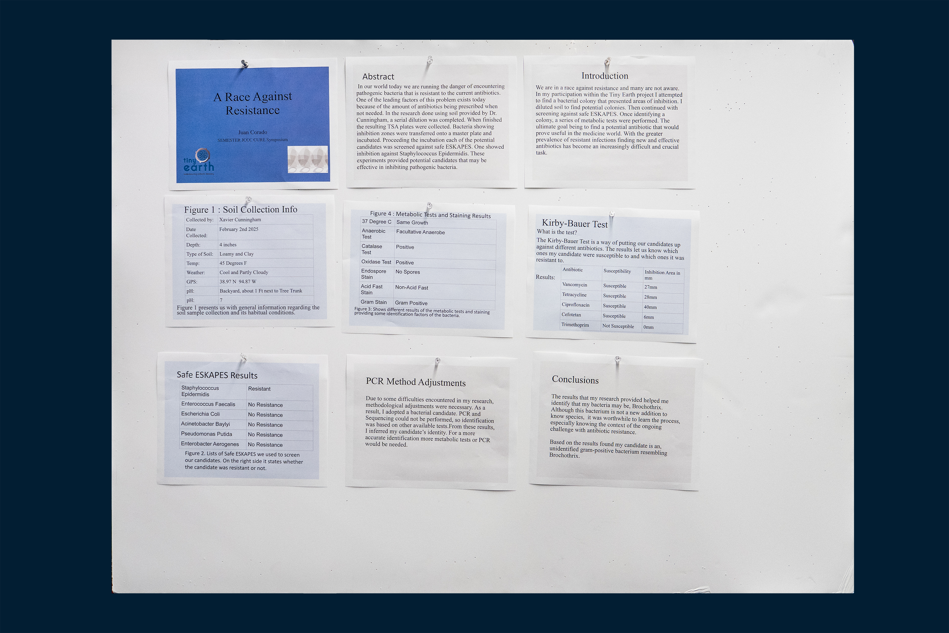 In our world today we are running the danger of encountering pathogenic bacteria that is not susceptible to any of the current antibiotics. One of the leading factors of this problem exists today because of the amount of antibiotics being prescribed when not needed. In the research done using soil provided by Dr. Cunningham, a serial dilution was completed. When finished the resulting TSA plates were collected. Bacteria showing inhibition zones were transferred onto a master plate and incubated. Proceeding the incubation each of the potential candidates was screened against safe ESKAPES. One showed inhibition against Staphylococcus epidermidis. These experiments provided potential candidates that may be effective in inhibiting pathogenic bacteria.