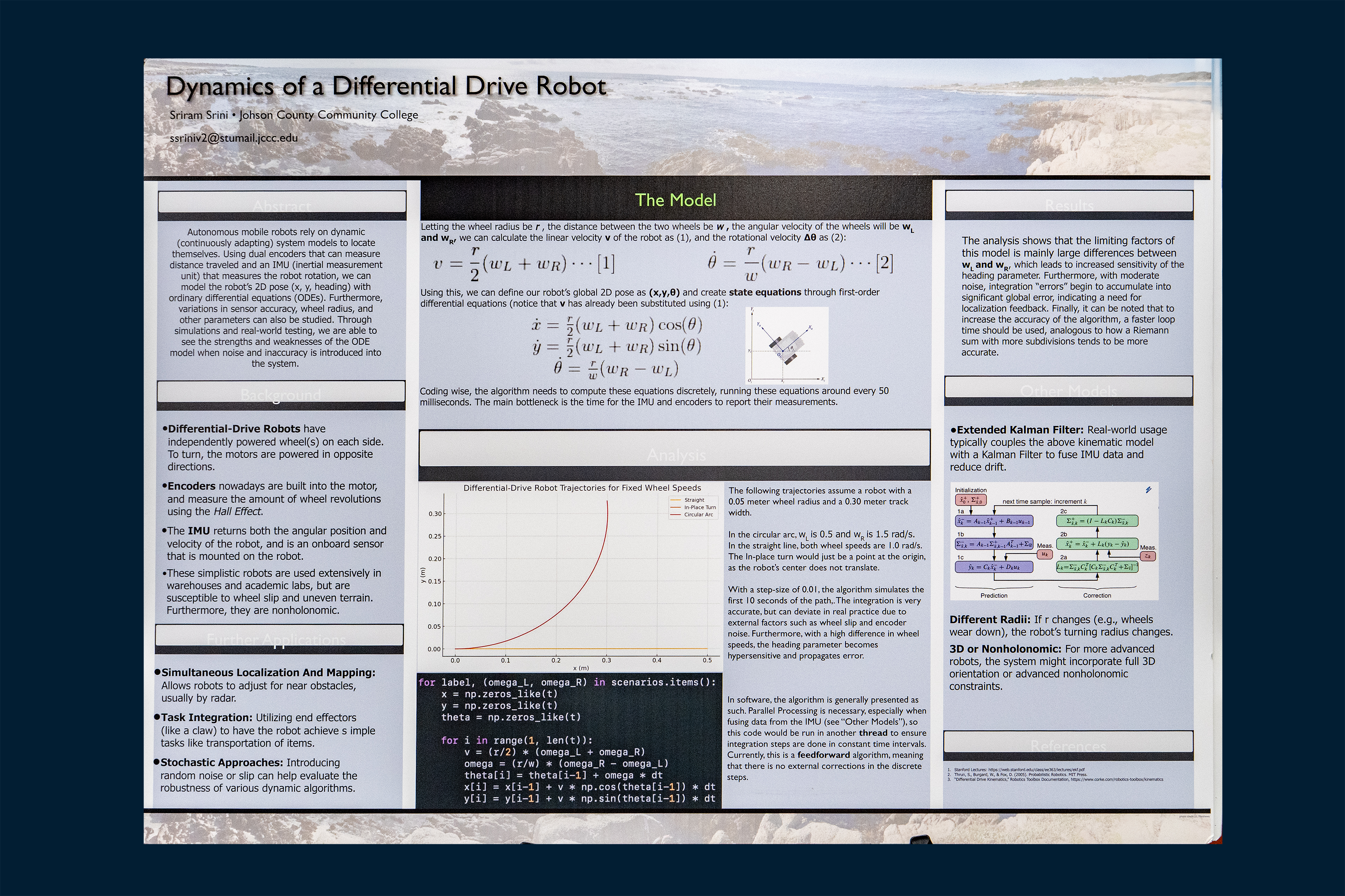 Autonomous mobile robots rely on dynamic (continuously adapting) system models to locate themselves. Using dual encoders that can measure distance traveled and an IMU (inertial measurement unit) that measures the robot rotation, we can model the robot’s 2D pose (x, y, heading) with ordinary differential equations (ODEs). Furthermore, variations in sensor accuracy, wheel radius, and other parameters can also be studied. Through simulations and real-world testing, we are able to see the strengths and weaknesses of the ODE model when noise and inaccuracy is introduced into the system.
