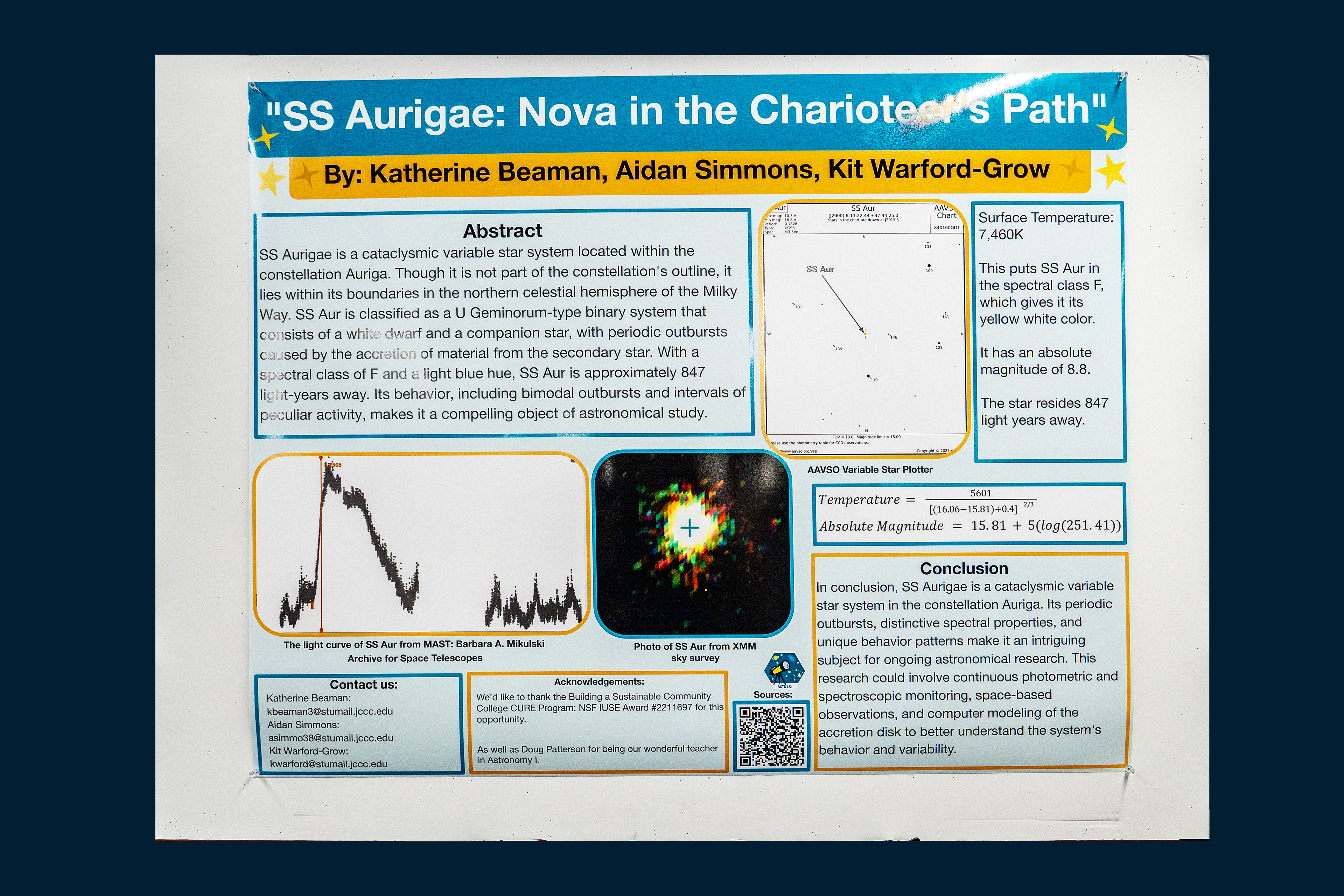 SS Aurigae (SS Aur) is a UGSS star first examined by E. Silbernagel on October 13th, 1906. SS Aur, while named after the constellation Auriga, the charioteer, is not a part of the outline of the constellation but within it. SS Aur is located in the northern celestial hemispheres of the Milky Way galaxy. The right ascension is 4.149 hours, and the declination is -23.395 degrees. SS Aur is in the spectral class of B, meaning it is a light blue. It would take 847.357 light years to travel to SS Aur. SS Aur is a cataclysmic-variable star in a binary system. This means that the star is always changing in brightness, intensity, and color, with some sudden outbursts of energy. The star is a system of two stars, a white dwarf and a secondary star. The secondary star orbits around the white dwarf and is pulled in and used as fuel by the dwarf. A disk forms around the system, and sometimes there are sudden, unexpected outbursts of energy.
