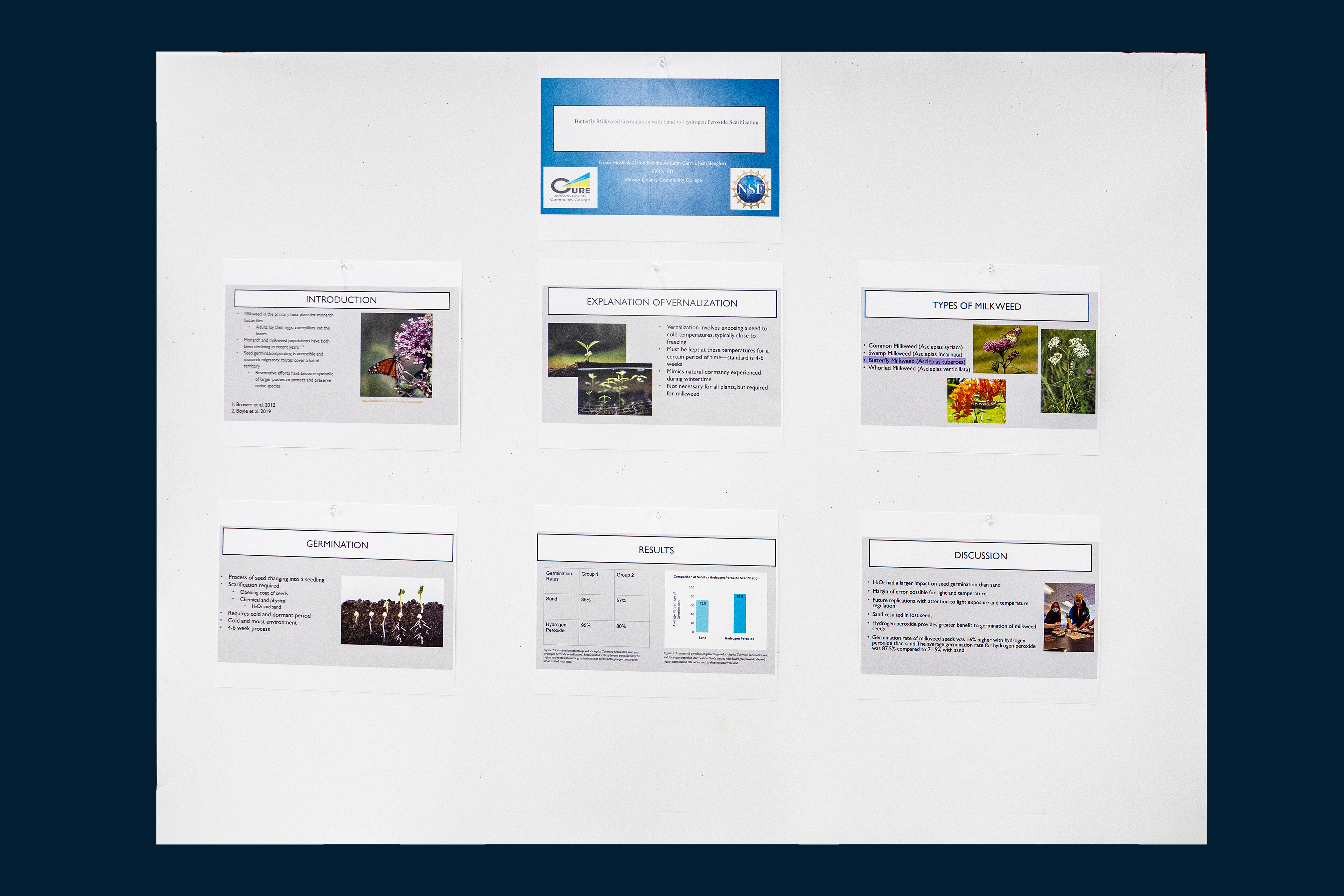 Research of most effective germination techniques for butterfly milkweed seeds. Significance includes developing methods for individuals to have the opportunity to grow milkweed to contribute to the conservation efforts of the monarch butterfly. Researchers aimed to study which method of scarification—sand or hydrogen peroxide—was more effective in germinating butterfly milkweed seeds. Researchers set up 80 butterfly milkweed seeds across 4 separate containers, with 20 seeds in each container—2 petri dishes with H2O2 and 2 bags of sand. After letting the containers sit for 4 weeks, researchers set up the seeds to germinate for 6 weeks and recorded results afterwards. The hydrogen peroxide groups produced higher germination rates and larger sprouts than the sand groups, but some margin of error may be included for factors such as temperature and light during germination. Additional replications are needed with attention to light exposure and temperature regulation. Implications of this research include conservation of monarch butterfly populations and habitat restoration.