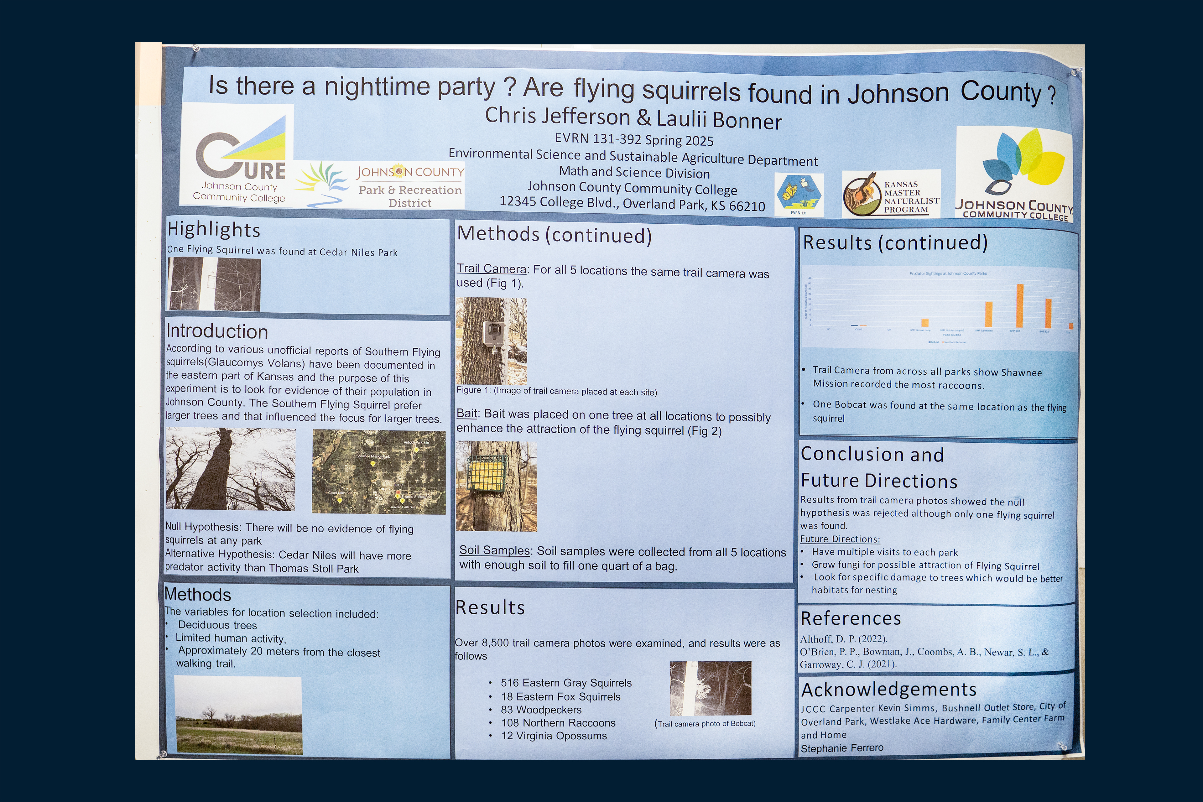 Southern flying squirrels have been documented and seen in Kansas for many years. Since they are nocturnal researchers must conduct an experiment using various techniques to catch footage of the flying squirrel. The purpose of this experiment would be to further prove evidence of their existence in Johnson County Kansas. To do this, researchers must place cameras and acoustic microphones to pick up the pitch of the squirrel. Nest boxes were also made for researchers to attract the squirrel. The overall goal is to find out if predators have any effect on whether the squirrels will have reduced presence of detection rates. In previous research by prior researchers trees and nesting played a factor as well. Researchers anticipate the flying squirrel to not be affected by predation but there will be less activity in certain parks compared to recent years.