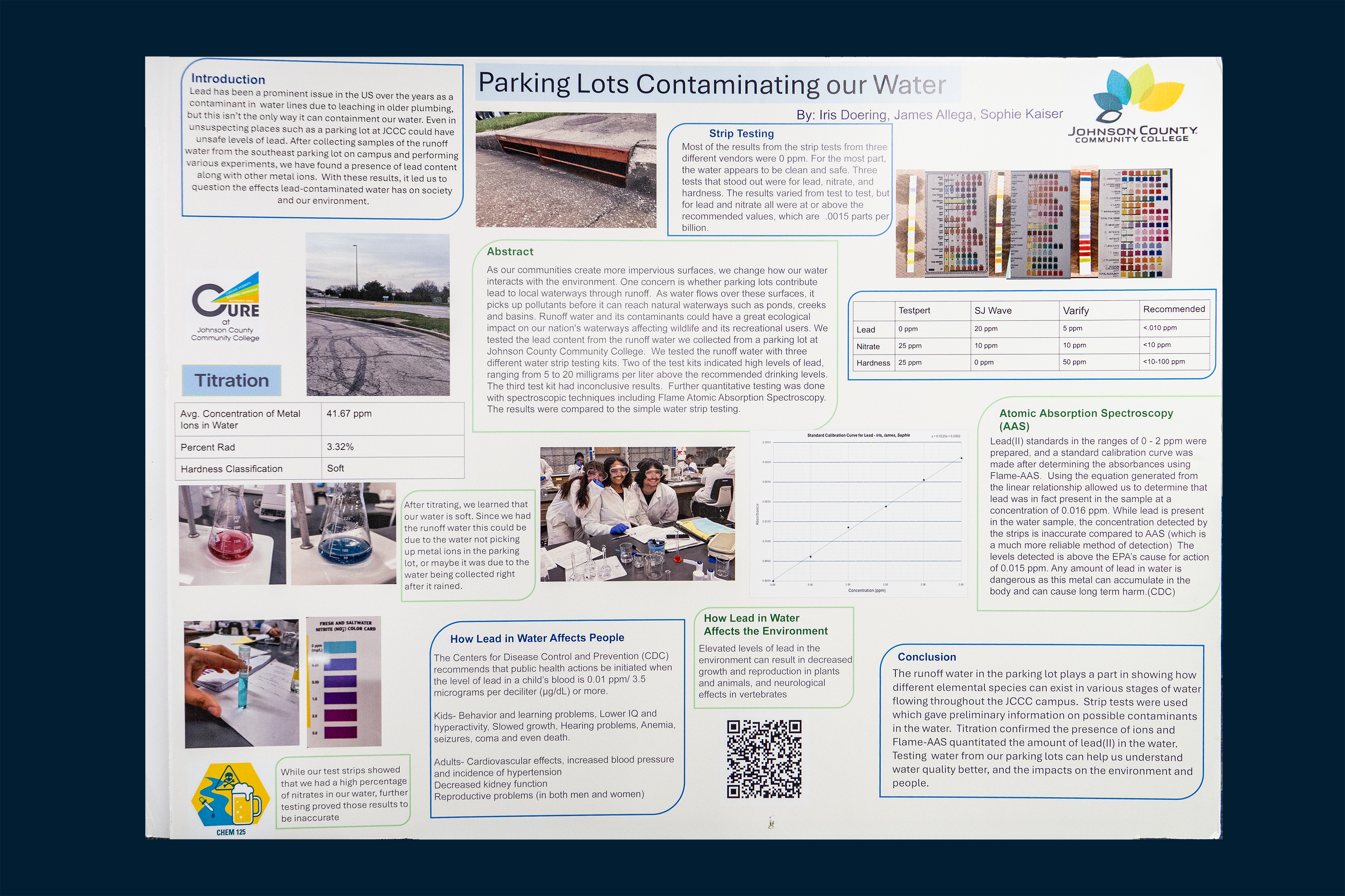 As our communities create more impervious surfaces, we change how our water interacts with the environment. One concern is whether parking lots contribute lead to local waterways through runoff. As water flows over these surfaces, it picks up pollutants before it is able to reach natural waterways such as ponds, creeks and basins. Runoff water and its contaminants could have a great ecological impact on our nation's waterways affecting wildlife and its recreational users. We tested the lead content from the runoff water we collected from a parking lot at Johnson County Community College. We tested the runoff water with three different water strip testing kits. Two of the test kits indicated high levels of lead, ranging from 5 to 20 milligrams per liter above the recommended drinking levels. The third test kit had inconclusive results. Further quantitative testing was done with spectroscopic techniques including Flame Atomic Absorption Spectroscopy. The results were compared to the simple water strip testing.