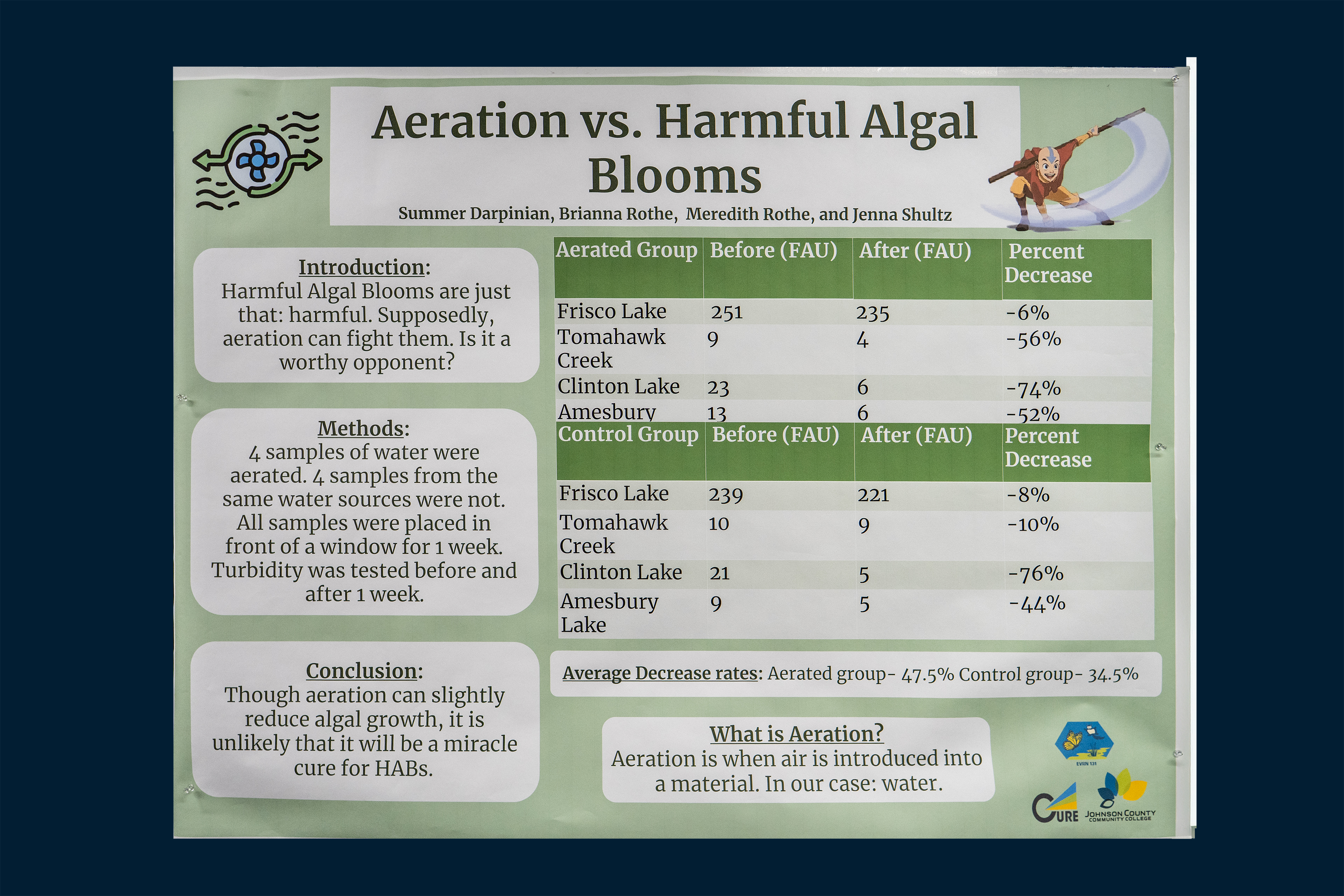 We are looking at whether aeration makes a difference in the growth of algae in different bodies of water in the KC area.